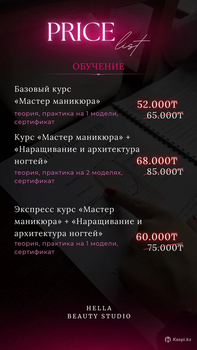 БАЗОВЫЙ КУРС МАНИКЮРА Хочешь начать карьеру мастера и уверенно зарабатывать? Сделай первый шаг вместе с нами! Что тебя ждет: — Преподаватель с опытом 10 лет — Теория + практика на моделях — Отработка покрытия гель-лаком — Индивидуальный подход к каждому ученику — Постоянная поддержка после окончания курса — Выдаем сертификат ВОЗМОЖНА ОПЛАТА ПО КАСПИ РЕД В РАССРОЧКУ! Место проведения: ул. Конституции Казахстана, 4 Запись - по телефону Стань мастером, к которому возвращаются!