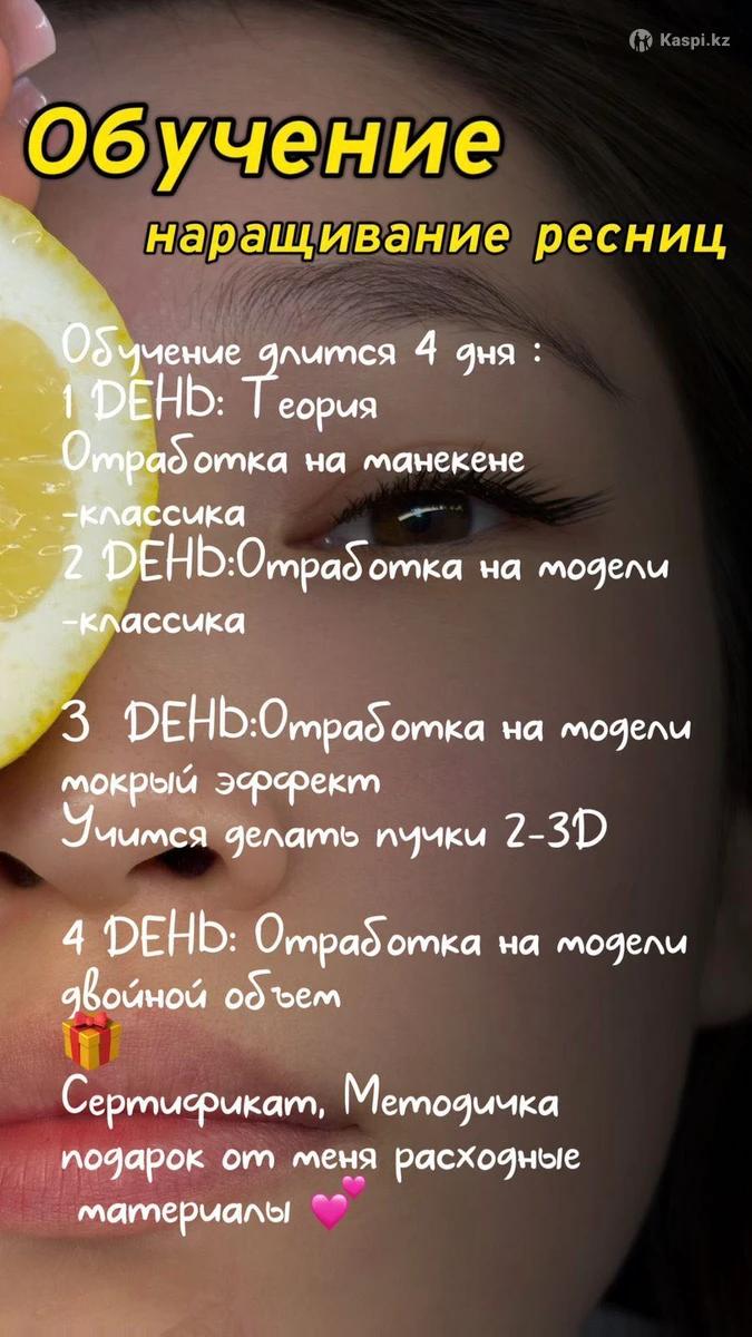 обучение на наращивание ресниц Всего за 50000 тг 🎉😍 Обучение длится 4 дня 1 день теория 2-4 работа с пучками, и работа с моделями Выдаются сертификат + в подарок 🎁 эффект лучики+ мокрый + электронный 📕 и еще + расходные материалы для старта От меня😍