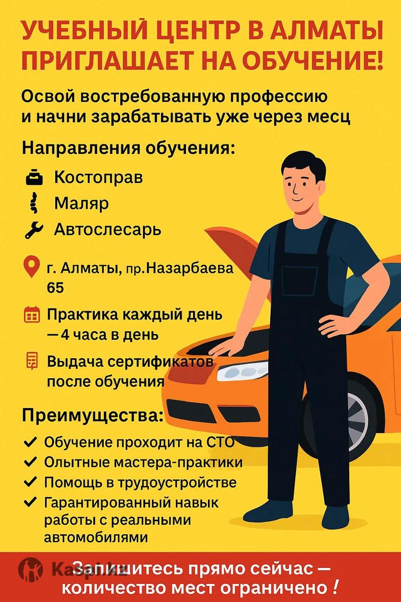 🏫 Учебный центр в Алматы приглашает на обучение! Освой востребованную профессию и начни зарабатывать уже через месяц 💼 🔧 Направления обучения: • Костоправ • Маляp • Автослесарь 📍Адрес: г. Алматы, пр. Назарбаева 65 📅 Практика каждый день — 4 часа в день 🎓 Выдача сертификатов после обучения 🚗 Преимущества: ✔ Обучение проходит на СТО ✔ Опытные мастера-практики ✔ Помощь в трудоустройстве ✔ Гарантированный навык работы с реальными автомобилями 💪 Работа автослесаря — это стабильный доход и востребованность в любое время! 📞 Запишитесь прямо сейчас — количество мест ограничено!