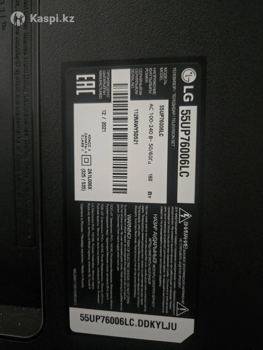 Всем хорошего дня! Продам телевизор в отличном состоянии. Телевизор LG 55UP76006LC Экран: 55 дюймов (139 см) с разрешением 3840x2160 (4K Ultra HD). Тип матрицы и подсветки: IPS-панель с прямой светодиодной подсветкой (Direct LED). Частота обновления: 60 Гц. Аудио: 2.0-канальная система мощностью 20 Вт с поддержкой технологий AI Sound и Ultra Surround. Интерфейсы: 2 порта HDMI 2.0 (один с поддержкой eARC), 1 порт USB, оптический аудиовыход, Ethernet (LAN), Wi-Fi и Bluetooth 5.0