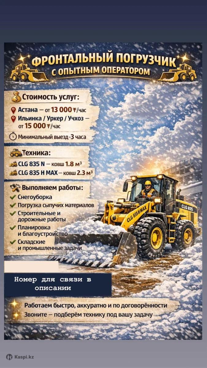 ✨🚜 Фронтальный погрузчик с опытным оператором 🚜✨ ➡ Стоимость услуги: ❄ Астана — от 13 000 тг/час 🏞 Ильинка, Уркер, Учхоз — от 15 000 тг/час ⏱ Мин. выезд 3 часа ➡ Модели погрузчиков: 🔹 CLG 835 N — 1.8 м3 🔹 CLG 835 H MAX — 2.3 м3 ➡ Выполняем работы: ❄ Снегоуборка 🟤 Погрузка сыпучих материалов 🏗 Стройка и дорожные работы 🌿 Планировка и благоустройство 🏭 Складские и промышленные задачи ✨━━━━━━━━━━━━✨