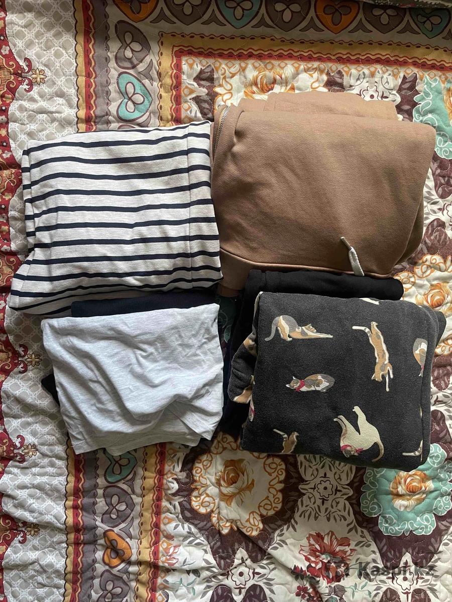 Продам - два костюма из футера трехнитки (худи с секретами для кормления и брюки с бандажом) - чёрный с принтом кошек и коричневый Бренд I love mum, 46 размер - две футболки для беременных и кормящих с секретами для кормления: чёрная из трикотажа в рубчик, серая трикотажная Бренд I love mum, 46 размер - платье трикотажное с секретом для кормления в полоску 46 размер Все вещи чистые, платье надевала всего пару раз, остальные вещи носила недолго во время беременности. Продам все вещи в одни руки! Самовывоз и примерка Район КШТ, могу привезти по договорённости по КШТ покупателю. Звонить на номер дважды, первый звонок не доходит. Если не отвечаю, можно написать на этом же номере либо писать в сообщения на сайте. Реальному покупателю ещё уступлю