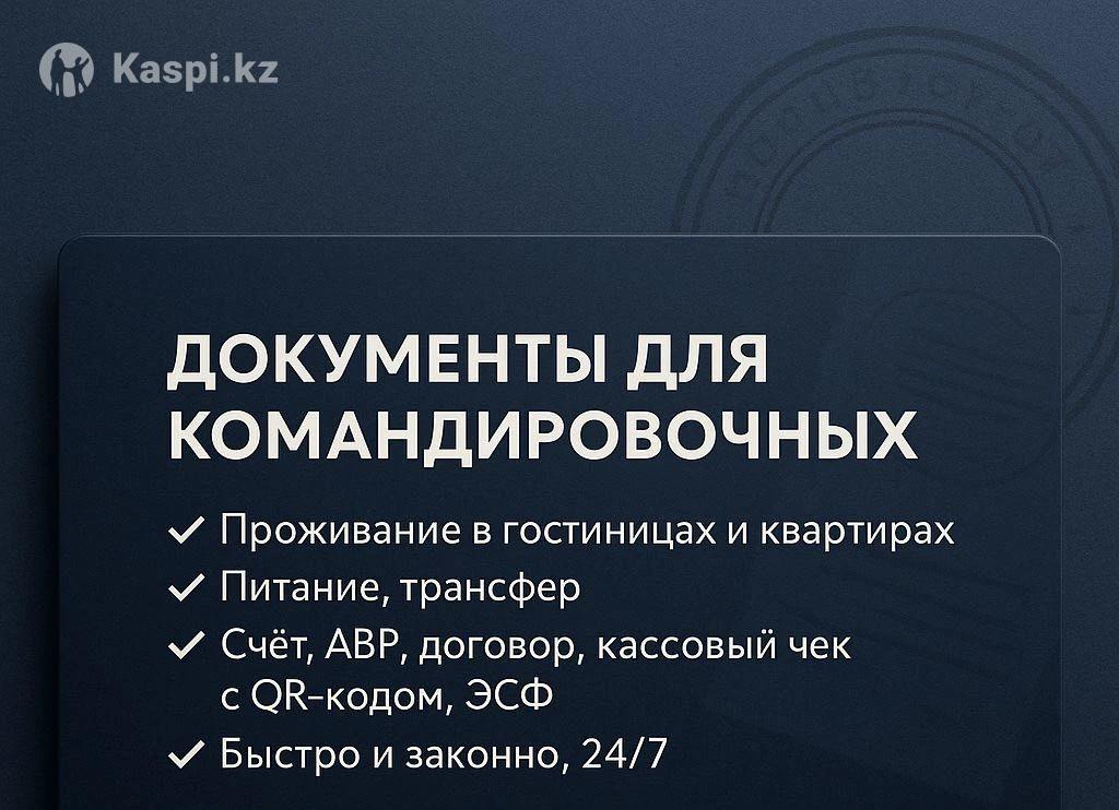 Оформление командировочных документов. 🔥 КОМАНДИРОВОЧНЫЕ ДОКУМЕНТЫ — БЕЗ ЗАБОТ! 🔥 📑 Все официально и грамотно 🏠 Проживание в гостинице, квартире с документами 🚕 Трансфер, питание. 🧾 Настоящие чеки с кассового аппарата ⚡ Оперативно и в срок ✨ Для ИП и ТОО ✨ Законность и надежность ✨ Опыт и профессионализм 📞 🕐 Работаем 24/7 — всегда на связи!