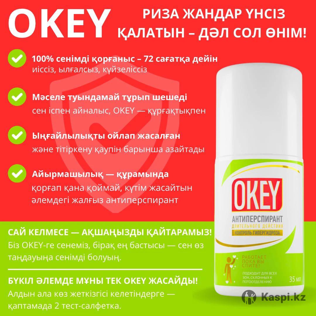 ✨ OKEY — антиперспирант нового поколения для тех, кто ценит уверенность, комфорт и заботу о себе. 😓 Избыточная потливость, 👕 мокрые подмышки, 👃 запах пота — всё это может вызывать стеснение, неуверенность и мешать наслаждаться каждым днём. 🛡️ OKEY помогает чувствовать себя свободно в любой ситуации. ⏱️ Он начинает работать именно тогда, когда это нужно, обеспечивая длительную защиту до семидесяти двух часов. 💚 Уникальная формула, созданная на основе современных дерматологических исследований, усилена 5 ухаживающими компонентами: • 🍃 Алоэ вера — успокаивает и смягчает • 💧 Гиалуроновая кислота — глубоко увлажняет • 🌼 Экстракт ромашки — борется с раздражением • 🧴 Пантенол — восстанавливает кожу • 🌱 Аллантоин — предотвращает покраснение 🌙 OKEY наносится на ночь на чистую и сухую кожу, 🚿 а утром легко смывается водой. 🚫 Никакой липкости, стянутости и запаха. ✅ Только комфорт, свежесть и уверенность в себе. 🌀 OKEY — это не просто антиперспирант. Это свобода быть собой. 🛒 Приобрести можно в магазине Kaspi — с официальной 🧾 гарантией качества.