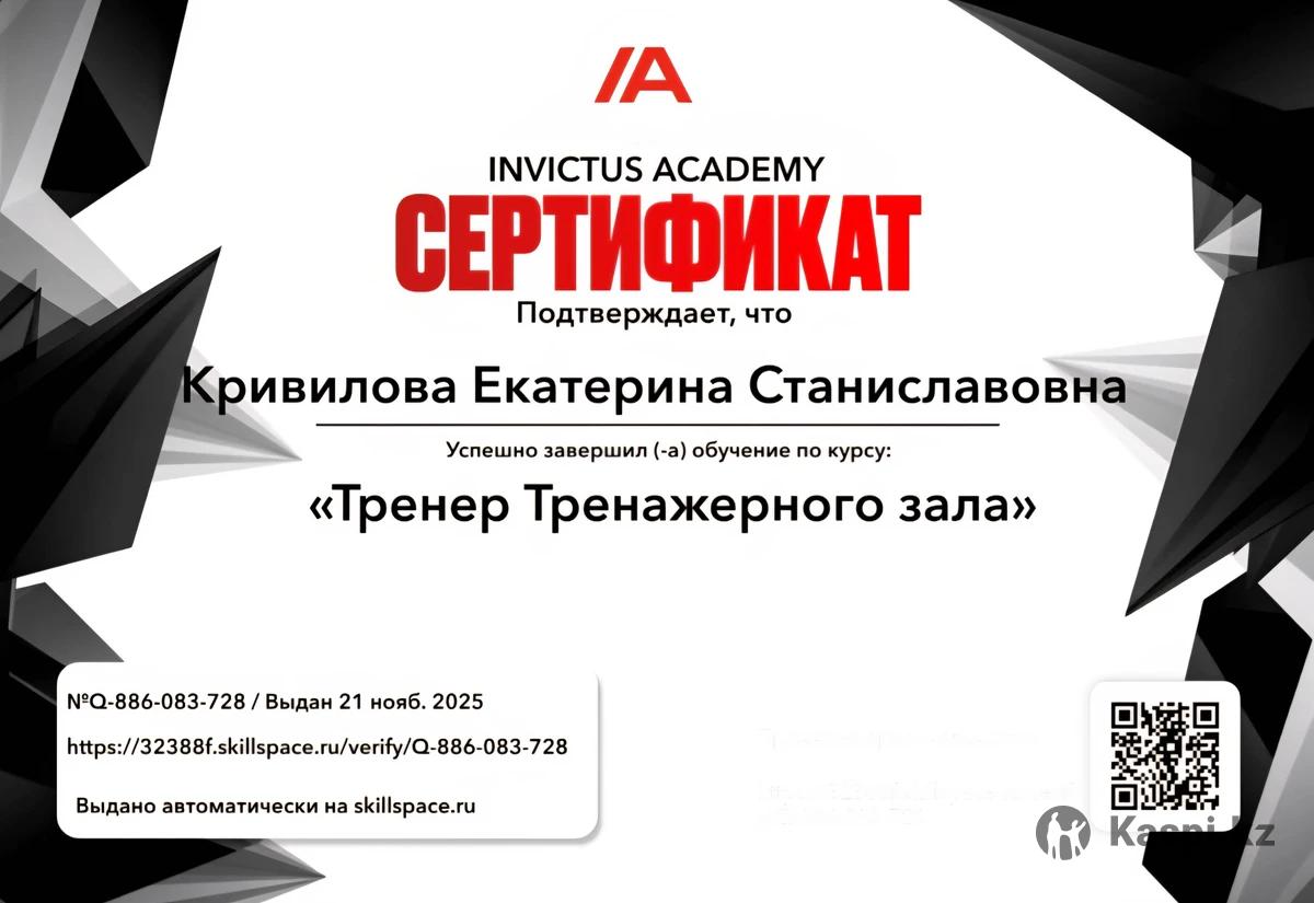 Я — молодой и энергичный тренер, который помогает похудеть, укрепить здоровье и почувствовать уверенность в своём теле. Для каждого клиента создаю индивидуальные программы тренировок и питания, учитывая цели, уровень подготовки и образ жизни. Я действующий тренер World Class. Работаю с людьми разного возраста и любой комплекции — от новичков до тех, кто уже имеет опыт тренировок. Работаю полностью онлайн — вы можете тренироваться в удобное для вас время. Я всегда на связи, поэтому каждая программа — это не просто план, а поддержка, контроль и ощущение, что вы не один на своём пути. Прайс на ведение: 15 000 тг — 12 онлайн-тренировок — индивидуальный план тренировок — контроль восстановления 20 000 тг — 12 онлайн-тренировок — план тренировок — план питания — ежедневный контроль питания Разовые услуги: 4000 тг — индивидуальный тренировочный план на месяц 6000 тг — детальный план питания 990 тг — видеосозвон + консультация по технике упражнений Почему стоит работать со мной: • Сертификат Invictus Academy • Работаю тренером в World Class • Индивидуальные онлайн-тренировки • Оценка физической формы и тестирование • Тренировки доступны 24/7 • Программы похудения и оздоровления • Персональные планы питания и тренировок • Постоянная поддержка и мотивация • Контроль прогресса • Энергичное и дружелюбное общение • Честный и доступный прайс без скрытых условий