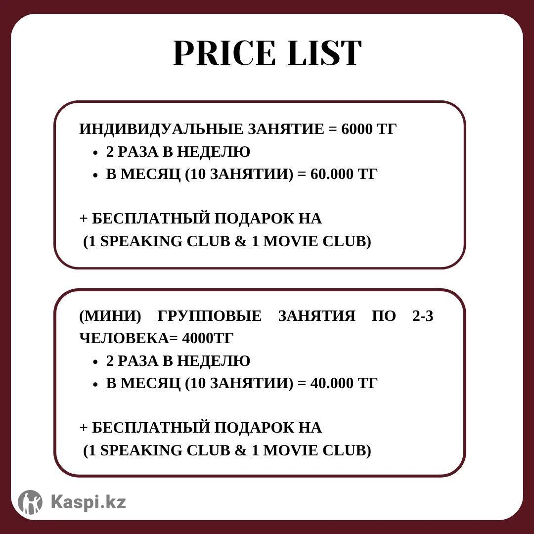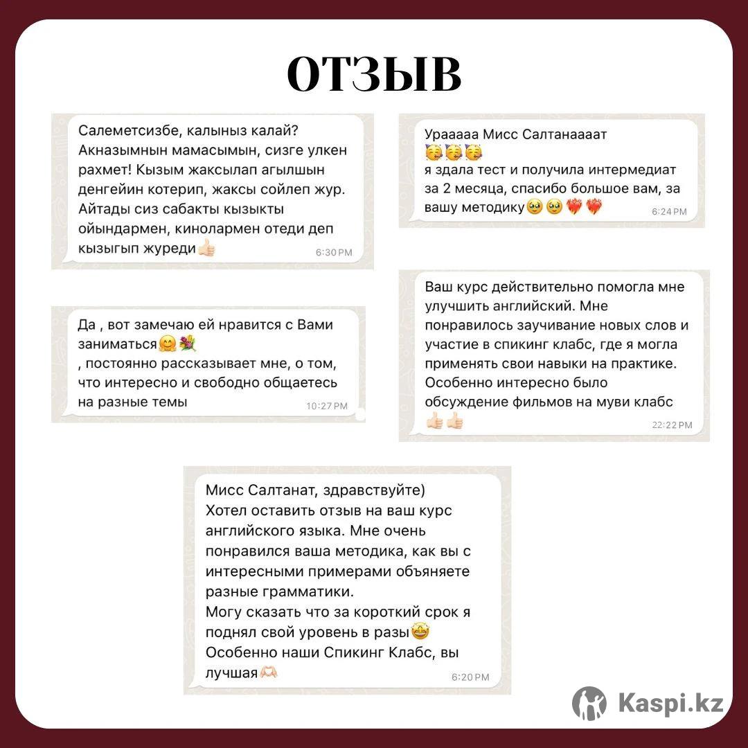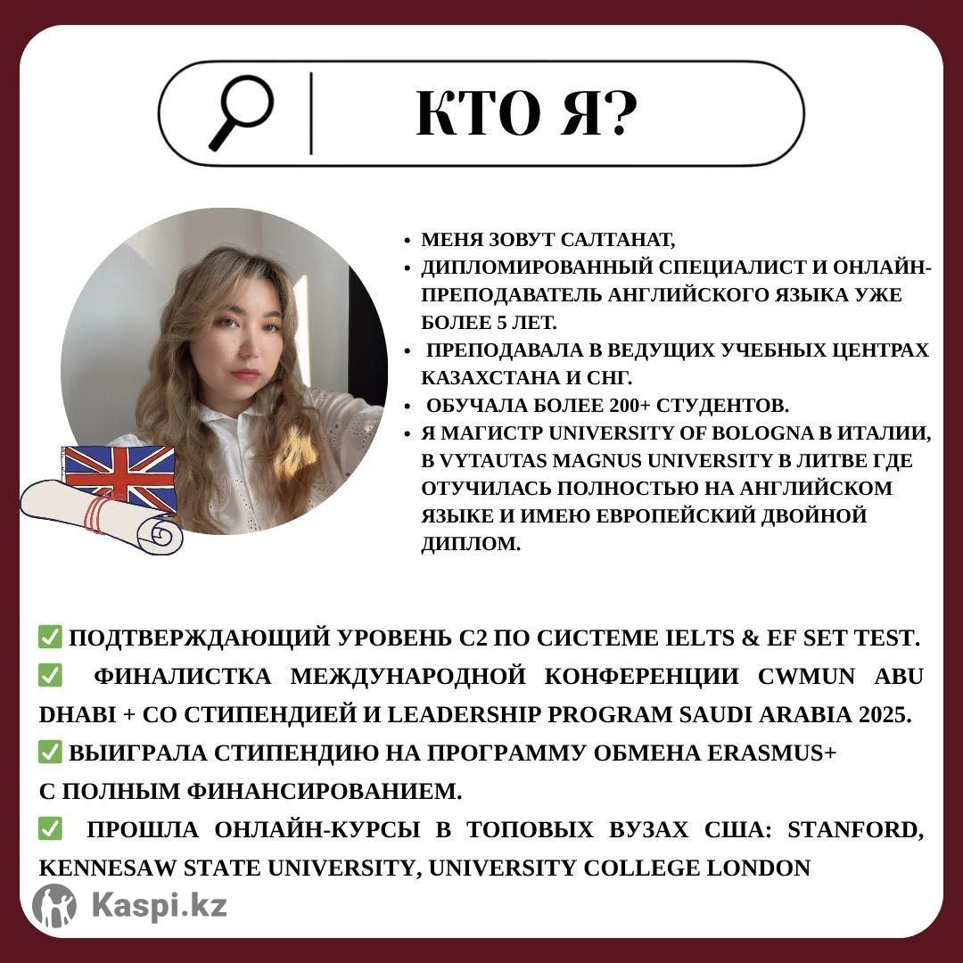 🇬🇧 Интенсивный курс английского языка Хочешь говорить по-английски уверенно, понимать носителей и использовать язык в жизни, учебе или карьере? Тогда мой интенсивный курс — именно для тебя! 👩🏻🏫 Обо мне: Я — Салтанат Абдиева, преподаватель с международным образованием. 🎓 Магистр University of Bologna (Италия) и Vytautas Magnus University (Литва), участница программы Erasmus+. 🌍 Победитель международных проектов в Саудовской Аравии и ОАЭ, проходила курсы в Stanford University и Kennesaw State University (США). 💬 За 5 лет обучила 200+ студентов из разных стран, помогая каждому заговорить легко и уверенно. 📚 Что тебя ждет: ✅ Интенсивная разговорная практика — ты начнешь говорить уже с первого урока ✅ Современные материалы, видео, диалоги и реальные жизненные ситуации ✅ Индивидуальный подход + гибкий график занятий ✅ Доступ к Google Classroom и интерактивным материалам ✅ Уровень от нуля до уверенного владения за 2 месяца 🔥 Пробный урок — бесплатно! 💰 Стоимость индивидуального занятия — всего 6000 тг 📩 Запишись сейчас — и начни говорить на английском с уверенностью и удовольствием!