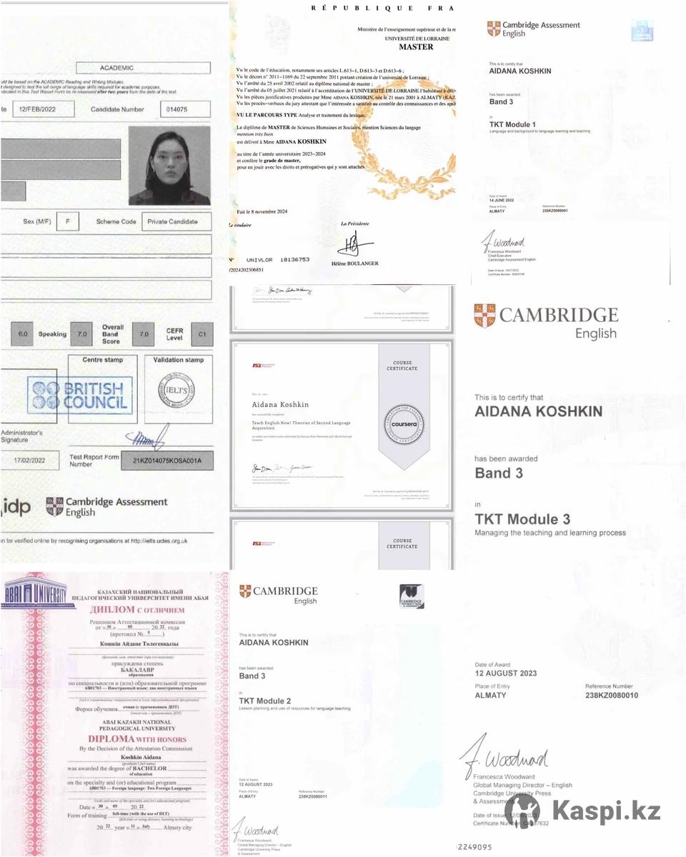 Хотите уверенно говорить на английском, расширить словарный запас и наконец-то понять грамматику? Готовитесь к учебе, работе или путешествиям? Тогда мои занятия для вас! Формат: онлайн по Google Meet Для кого: школьники, студенты и взрослые Направления обучения: • General English — от Beginner до Advanced • IELTS Preparation — стратегии, задания, Speaking & Writing практика На занятиях я использую комбинированный формат: современные учебники + интерактивные онлайн-платформы. Разнообразные активности и постоянная практика гарантируют результат. О преподавателе Меня зовут Айдана. Я - лингвист, учитель английского, выпускница программы Erasmus Mundus в лексикографии и PhD-исследователь в Венгрии. В своей работе я делаю акцент на разговорную практику, грамотность и уверенность в использовании языка. 🎓 Мои сертификаты и квалификация: • Cambridge TKT (Teaching Knowledge Test) • Международный опыт обучения и преподавания • Коммуникативный подход + современные методики Пишите в личные сообщения, подберу программу под ваши цели, уровень и удобное расписание. Начните учить английский легко и с удовольствием ✨