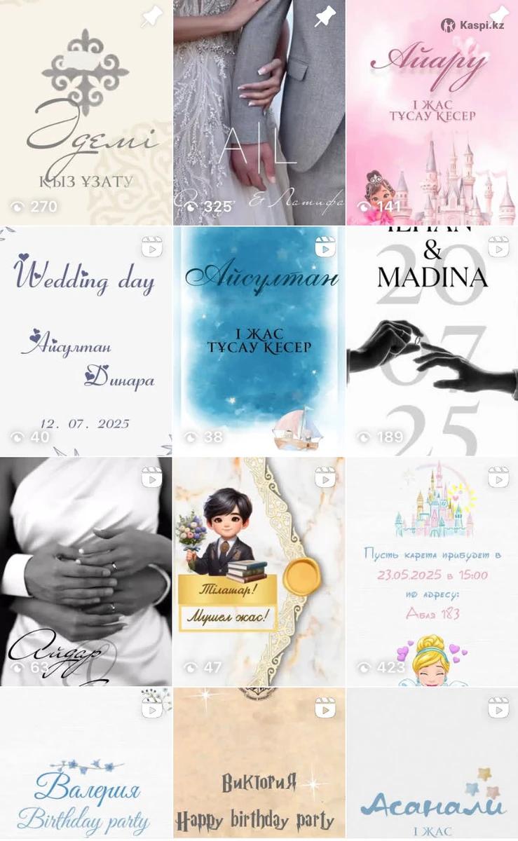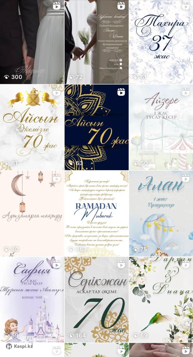 Электронные пригласительные в формате видео и фото на любые мероприятия(свадьба, день рождения,юбилей, корпоратив и т.д) -Цена от 1500тг -При заказе нескольких пригласительных-скидка -Готовность в течении 1-2 часов Красивый дизайн, индивидуальный подход, быстрое изготовление. -Инст :
