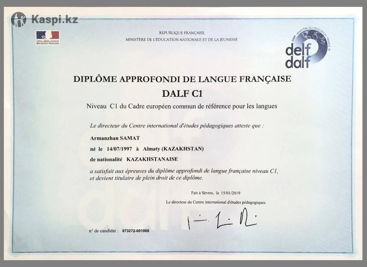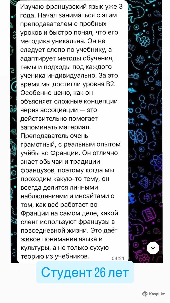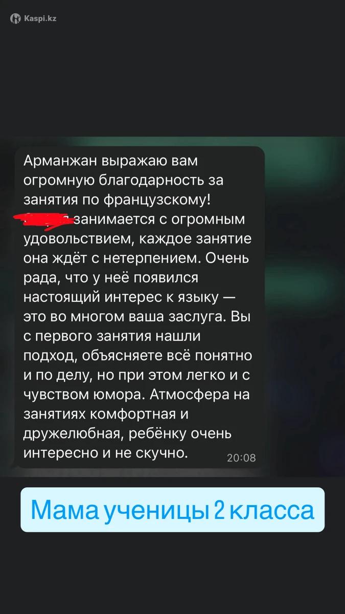 Здравствуйте! Меня зовут Арманжан, я преподаватель французского языка. Провожу индивидуальные онлайн-занятия для: — школьников (1–11 класс) — помощь с домашними заданиями, подготовка к контрольным и олимпиадам; — студентов — помощь с университетской программой, грамматикой, письмом и разговорной практикой; — взрослых — занятия для путешествий, работы или просто для души. Объясняю простым языком, даю знания шире школьной программы, развиваю разговорную речь и уверенность. Каждое занятие — по вашим целям и уровню.