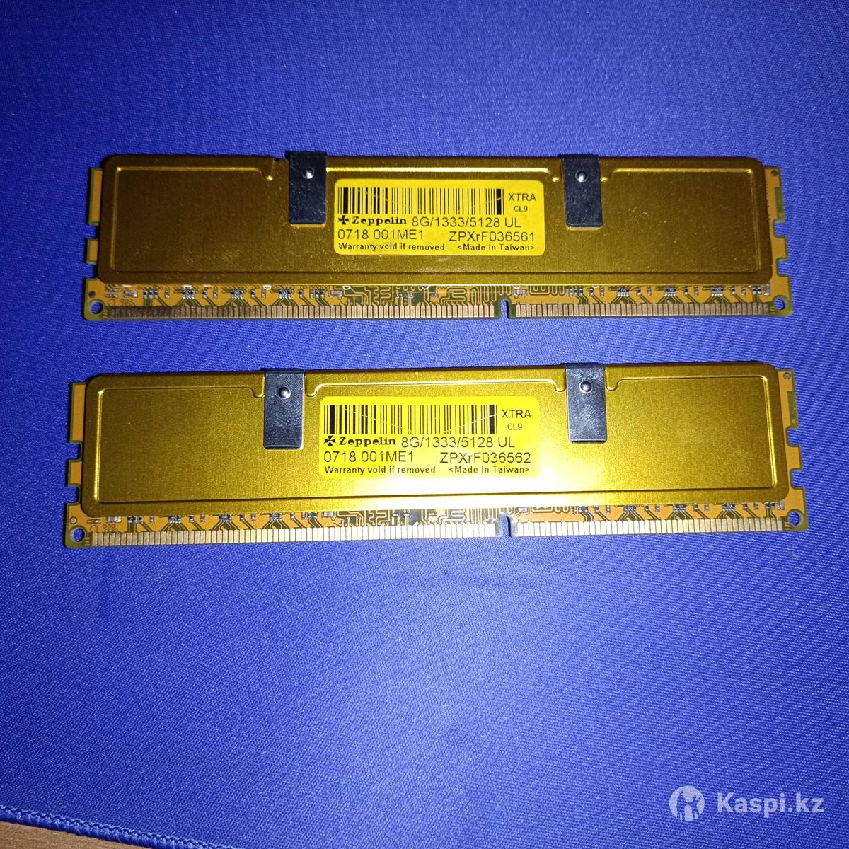 Продам комплект оперативной памяти DDR3 общим объем 16 ГБ. В комплекте две планки по 8 ГБ серии Zeppelin Gold, скорость 1333мгц. Работают идеально в двухканальном режиме. Каждая планка по 5000тг.