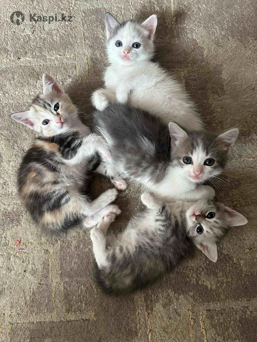 4 котенка, 3 девочки и 1 мальчик полосатый, возраст полтора месяца, не породистые, но один похож на сиамского