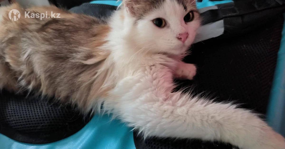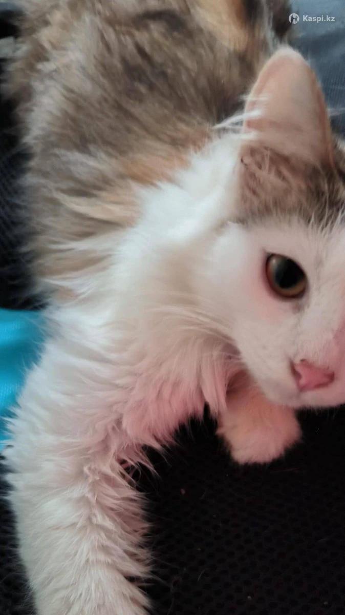 Домашняя, пушистая белая с рыже- серыми пятнами, приучена к лотку.