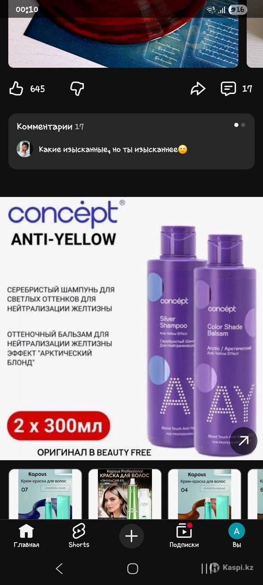 Продам оттеночный бальзам новый, concept оттенок Арктический блонд. Бальзам профессиональный, 300 мл. + Серебристый шампунь concept против желтизны, новый, 300 мл. Покупала за 6000 две банки, продам все за 3000.