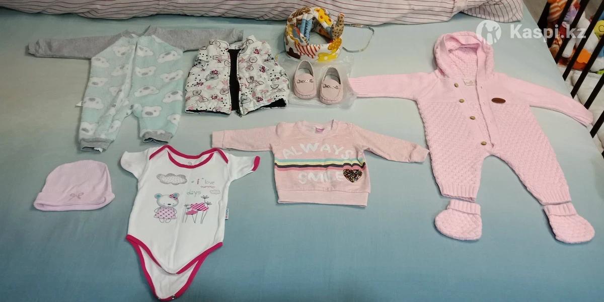 Продам пакет вещей на девочку 6 - 12 месяцев, 2 комбинезона, мокасины, шапочка для защиты головы, когда ребенок учиться ходить, жилетка, кофточка, боди, состояние хорошее, цена 5 тысяч, район ДСР.