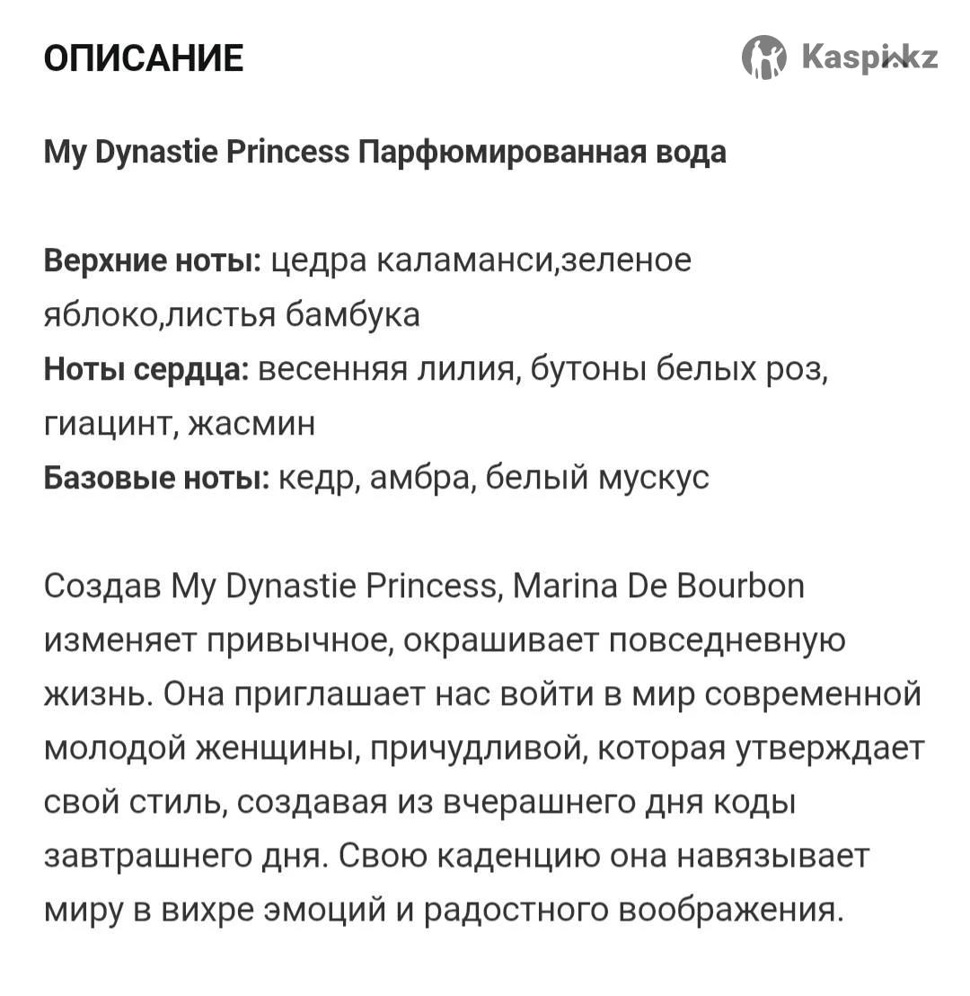 My Dynastie Princess Парфюмерная вода женская 100 мл Абсолютно новая, получила в подарок. Коробочки нет. В магазине 25 000 тг Предлагаю за 14 000 тг Азербаева 14 или договоримся