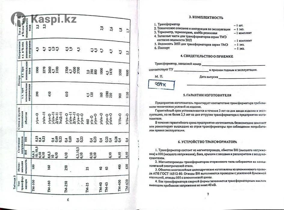 Паспорт на трансформатор со штампом ОТК