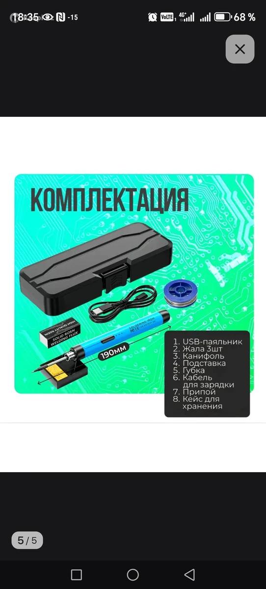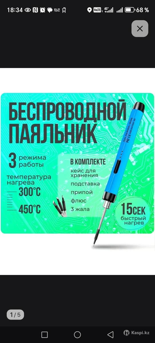 Беспроводной USB Паяльник 3-в-1 (Полный комплект) Профессиональное решение для быстрой пайки без розеток и лишних проводов! Главные фишки: Мгновенный нагрев: готов к работе за 15 секунд. 3 режима: регулировка температуры от 300°C до 450°C. Автономность: аккумулятор 800 mAh (до 20 мин работы). Зарядка Type-C: заряжается от повербанка, ноутбука или сети 5V. Что в комплекте: Паяльник (190 мм). Припой и канифоль. Подставка с губкой. Зарядный кабель. Жесткий кейс для хранения. Состояние: Новое, в упаковке. Идеально для ремонта электроники в дороге, авто или дом.