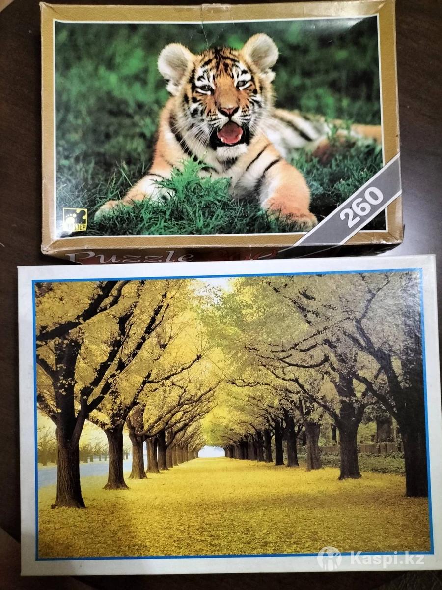 Пазл "Тигр", 260 штук. Производство Россия. Качество хорошее. 1000 тенге. Пазл "Золотая осень", 500 штук. Сложный. 1500 тенге.