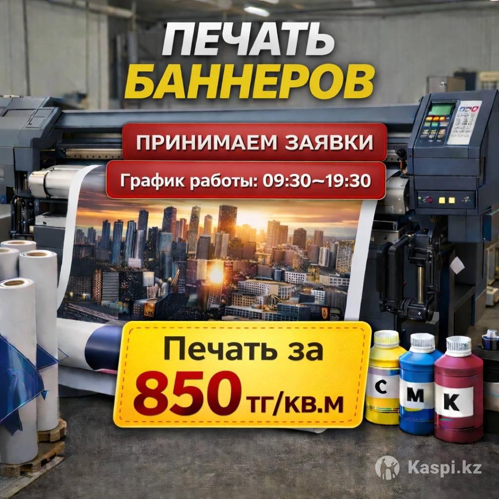 Предлагаем услугу по широкоформатной печати 850тг за кв/м. Материалы: баннер 340гр матовый; Также есть в наличии баннер блэкаут 340гр матовый. Сроки изготовления: от 1 часа при наличии готового файла. Свыше 100кв/м действует 10% скидка. Свыше 1000 кв/м действуют партнерские цены. Доставка по городу. Будем рады Вашим заявкам!