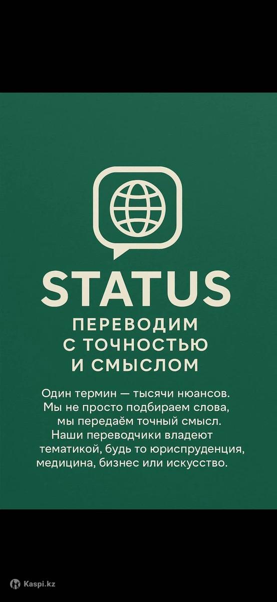Бюро переводов Status предлагает услуги по переводу документов ( паспорта, аттестаты, все виды свидетельств и справок, сертификаты, техпаспорта на транспорт, водительские права, медицинская, юридическая и техническая документация и др.). Переводим с/на казахский, русский, корейский, английский, китайский, немецкий, турецкий языки. Профессионализм, многолетний опыт, индивидуальный подход к каждому клиенту и высокое качество работы только у нас!!! Когда важен смысл- выбирают STATUS. Консультации-БЕСПЛАТНО! Адрес: г.Талдыкорган, Шевченко 148, угол улицы Жансугурова Тел.: ,