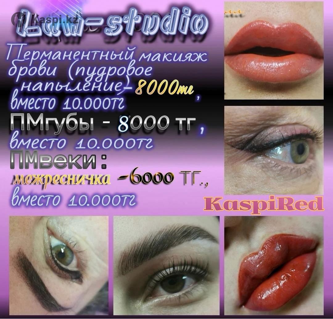 Перманентный макияж /татуаж /ПМ Стаж РАБОТЫ 8лет Пигменты люкс-класса Одноразовые расходники, вскрываются при вас Брови:пудровое напыление, теневая растушевка, градиент- 8000тг Перекрытие старого или не качественного татуажа с изменением цвета и формы -12000тг Аппаратные волоски-15000тг Смешанная техника(волоски+растушевка) - 10000тг Коррекция любой зоны- 5000 тг Губы-8000 тг Межресничка - 6000 тг Стрелочка 8000 тг Стрелочка с растушевкой +2000 тг Родинки, веснушки. Трихопигментация кожи головы(залысины, проплешины) - зависит от площади. МИНИ-ТАТУ - от 3000тг по вашему эскизу.