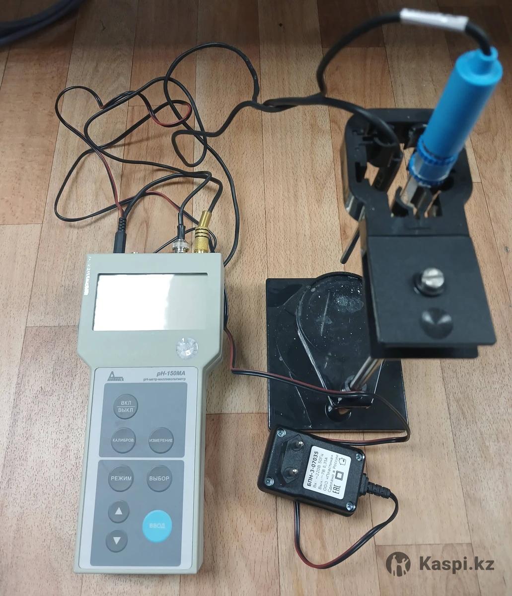 Переносной прибор для измерения кислотности (pH) и температуры водных растворов. Комплект: Измерительный блок, штатив, комбинированный электрод и блок питания.