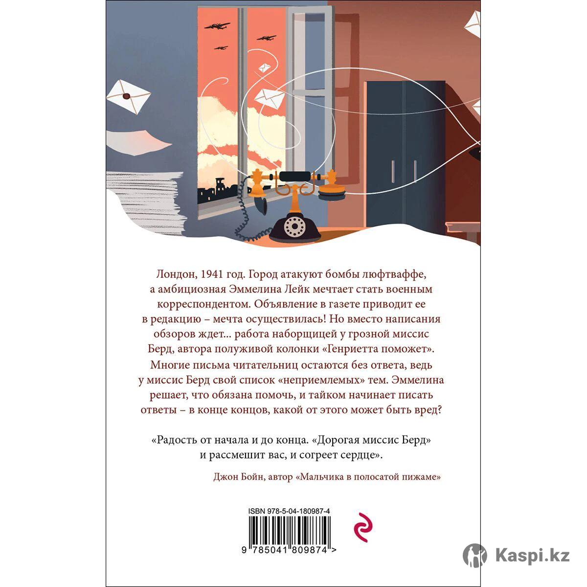 Трагикомический роман о девушке, воплотившей свою мечту, несмотря на ужасы военного времени. Лондон, 1941 год. Эммелина Лейк грезит стать военкором, но вынуждена работать наборщицей у сварливой миссис Берд. Втайне от начальницы девушка начинает отвечать на письма, оставленные миссис Берд без ответа. Разве может быть от этого вред? Роман о женской дружбе, сильных характерах, испытаниях и настоящих чувствах. «Радость от начала и до конца. "Дорогая миссис Берд" и рассмешит вас, и согреет сердце». — Джон Бойн, автор «Мальчика в полосатой пижаме» Переводчик: Чарный Влад.