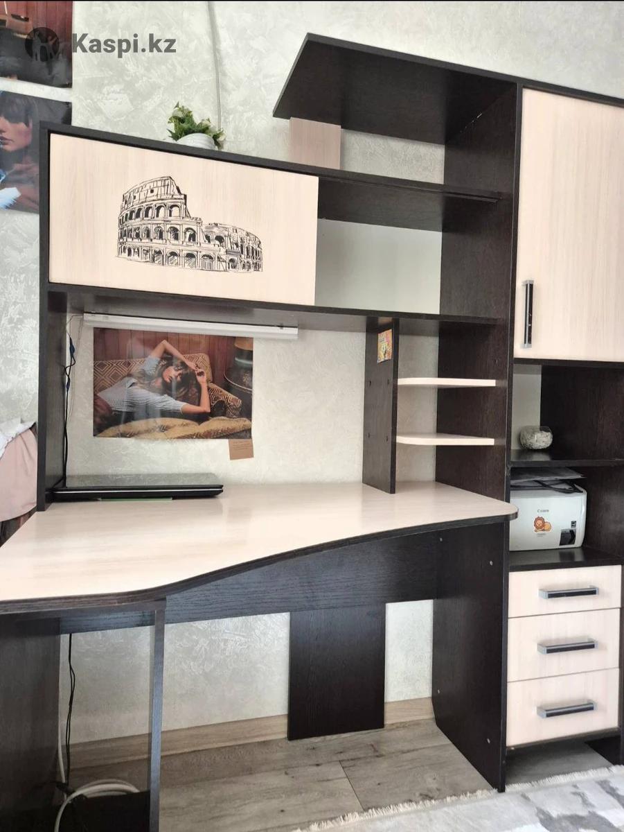 Письменный стол черно бежевого цвета, материал лдсп, имеется три выдживных ящика, один большой шкаф, 2 полки сверху, полки с купе дверцей, большой удобный стол, 180 высота;150 ширина; глубина 85; стол в отличном состоянии, торг уместен