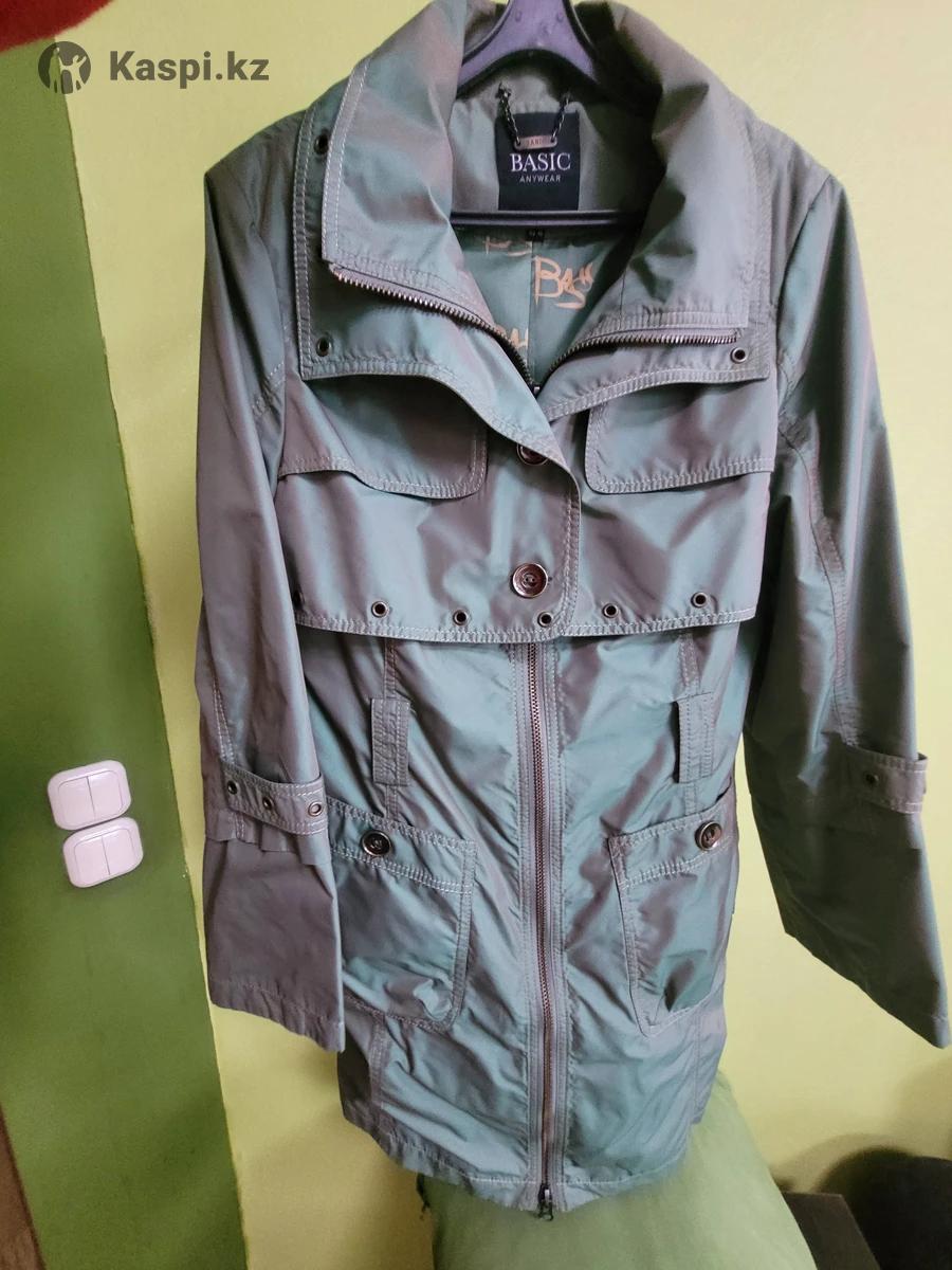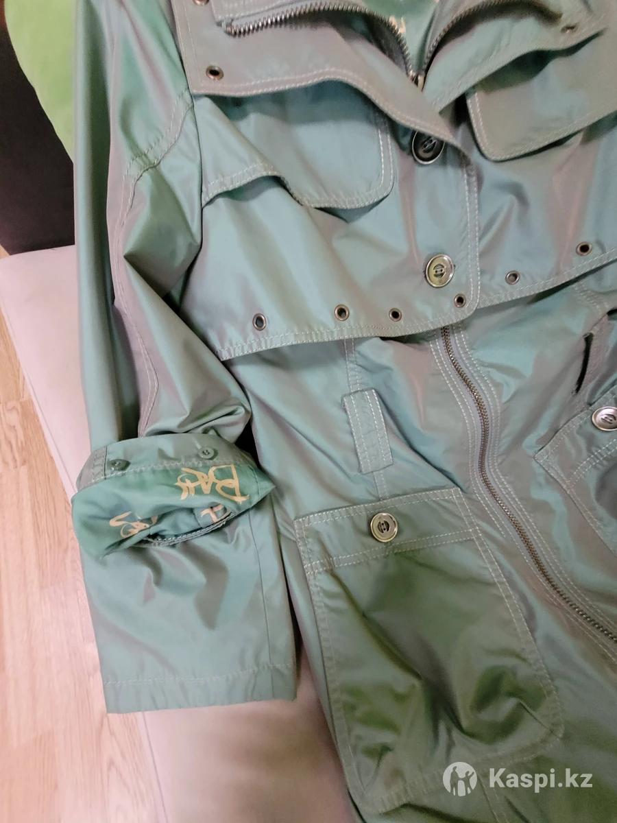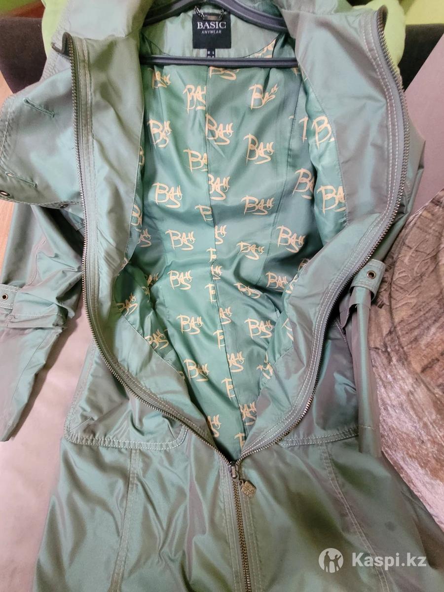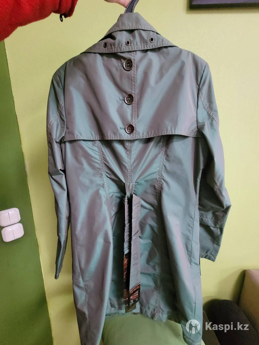 Классный плащ, цвет зеленый металлическая. Рукава отстегиваются на длину 3/4. До колен. В очень хорошем состоянии