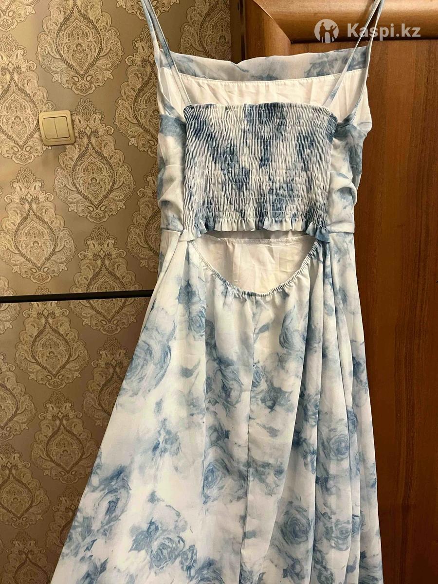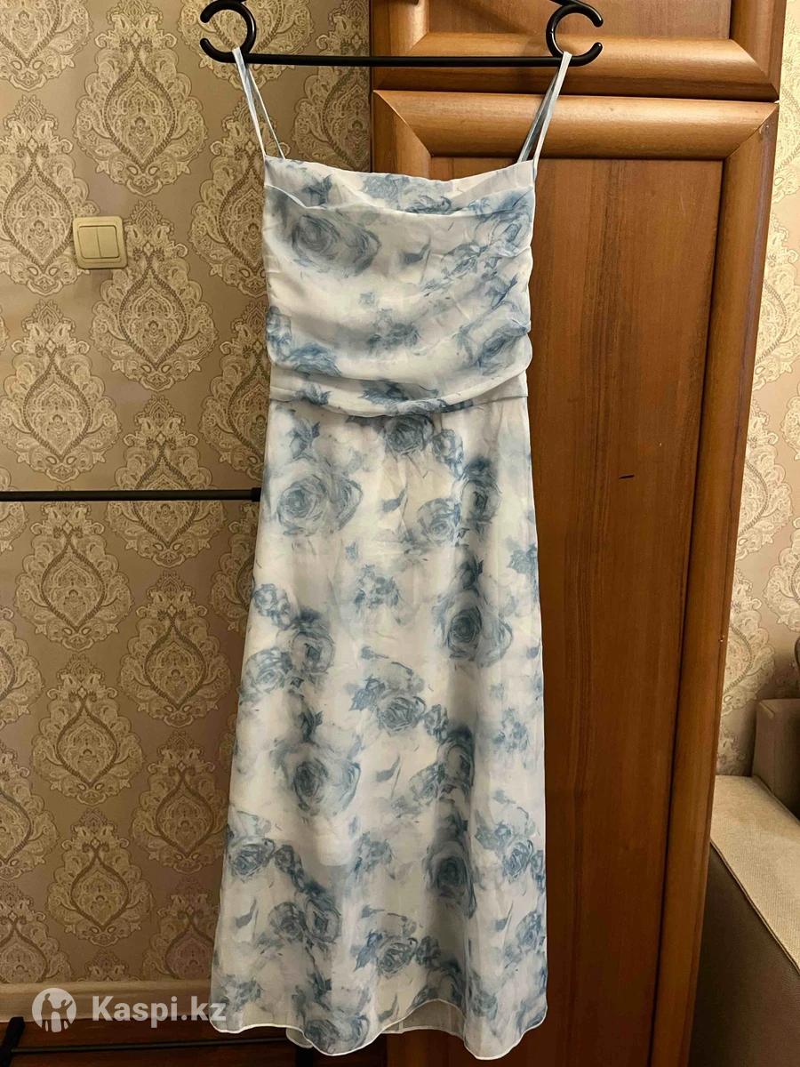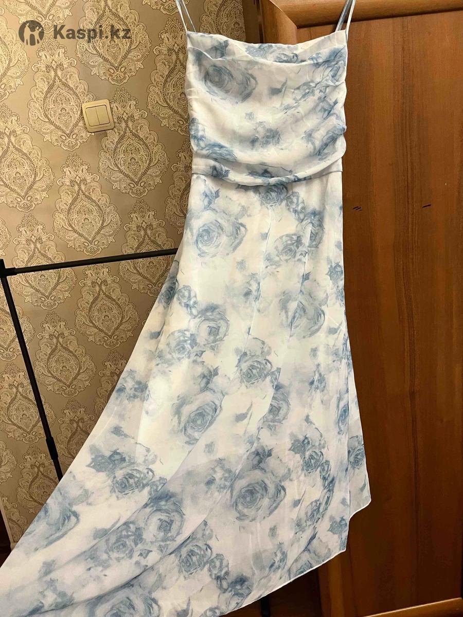 Материал: легкая струящаяся ткань •Длина: миди •Принт: голубые цветы на белом фоне •Детали: тонкие бретели, красивый драпированный лиф, свободный расклешенный низ