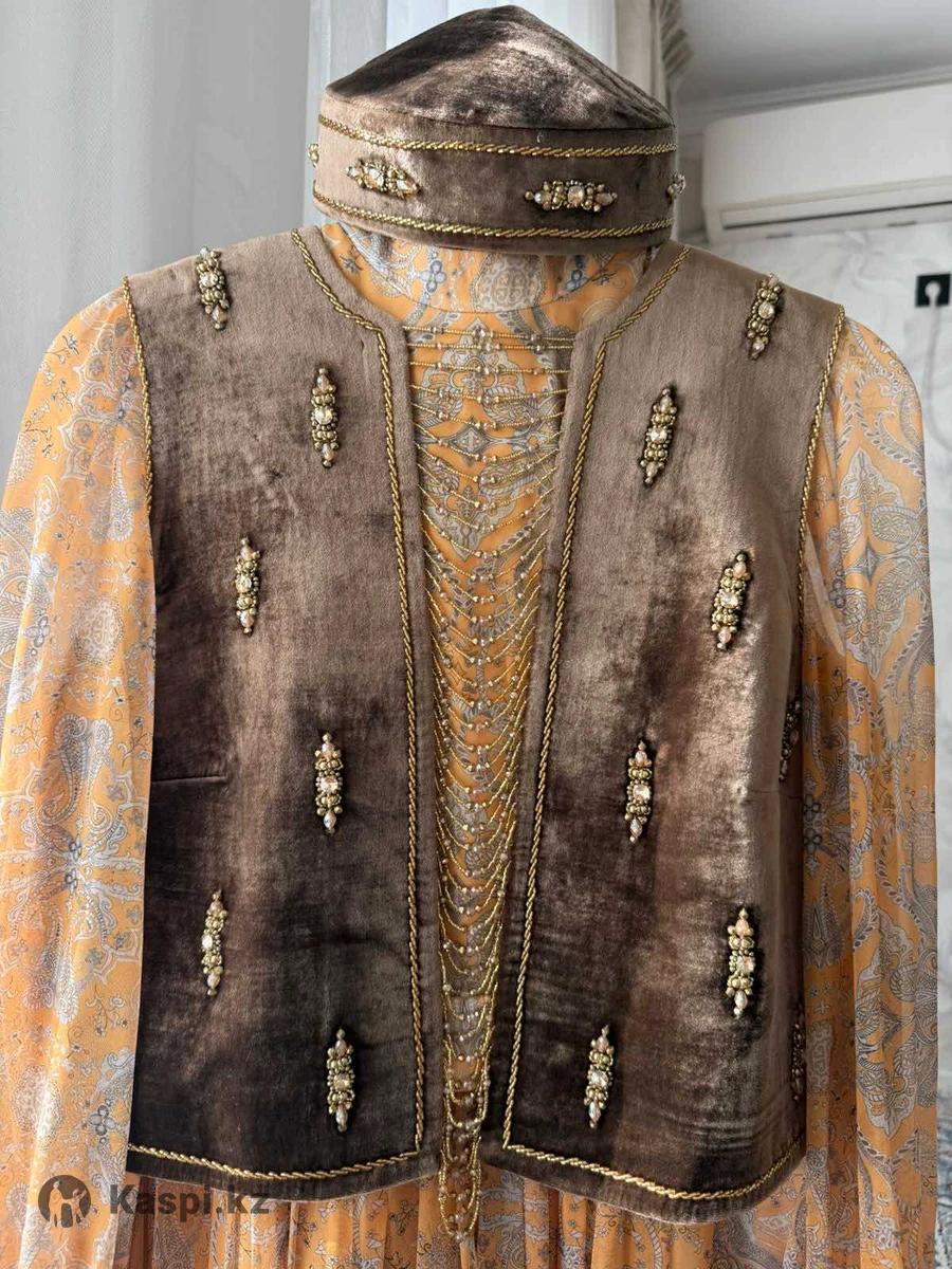 В идеальном состоянии. Надевала 1 раз. Сшили на заказ. Полный образ за 50 000тг. Размер до 48 подойдет