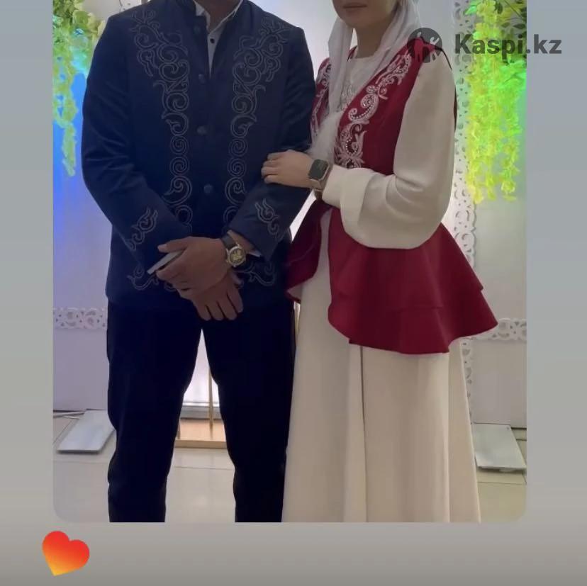Қазақша стильдегі келындерге арналған тойга көйлек. Сыртында жәкеті бар