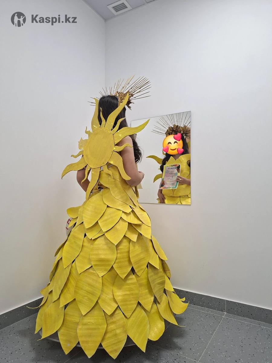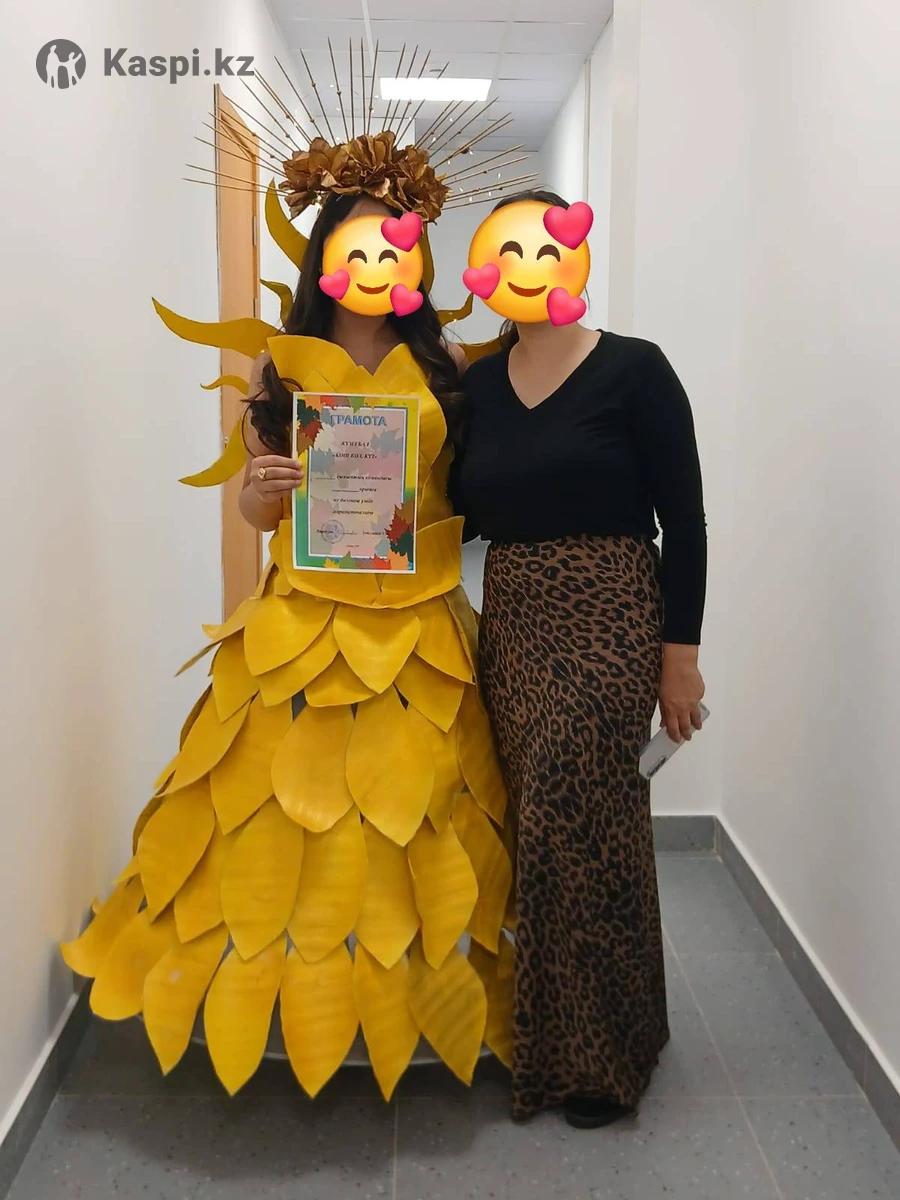 Продам платье изготовленное своими руками из фольгированной подложки, подъюбник на кольцах, верх отдельно. К костюму прилагается солнце на подсветке и корона также на подсветке. Платье победитель на осеннем балу. Есть еще и плащ накидка с капюшоном из искусственных листьев.