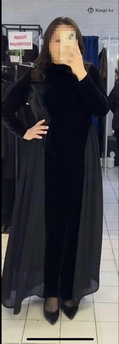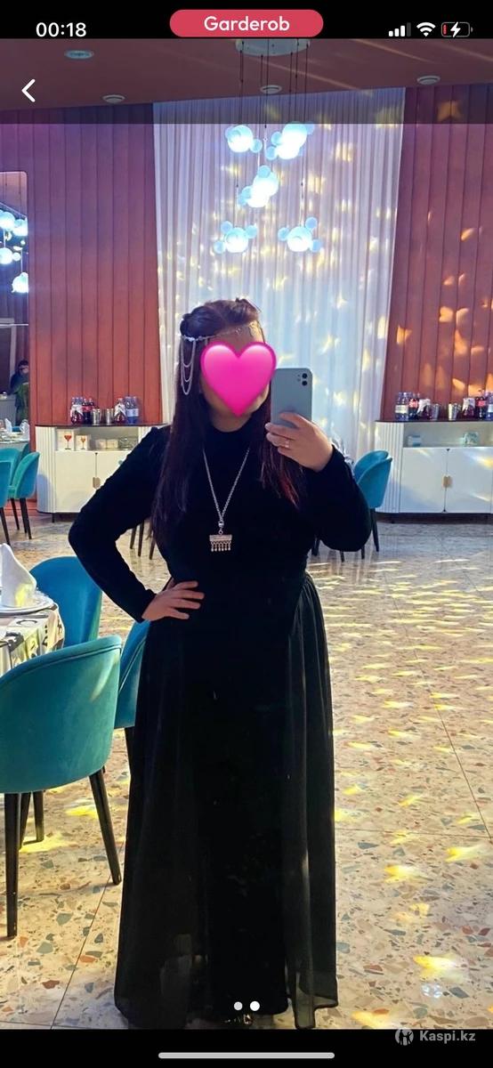 Черное платье из велюра, со вставками из шифона по бокам. Сзади молния и шнуровка как на корсете чтобы затянуть и подчеркнуть талию. Очень эффектно смотрится. Подойдет от L до 2XL. Надевалось один раз на мероприятие.