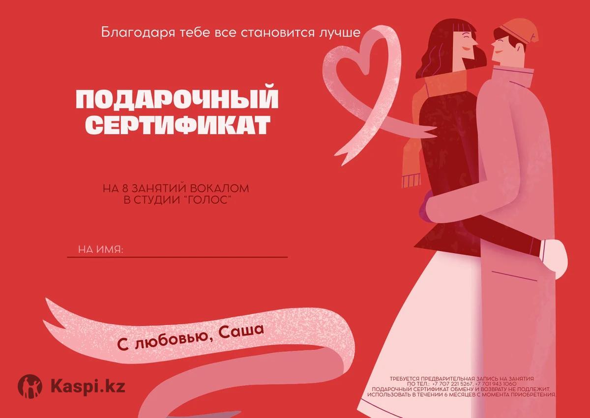 Приобретайте подарочные сертификаты на уроки вокала в студию "Voice" День Рождения, Рождество, 14 Февраля, 8 марта! Пробный урок – 7.000тг 4 урока – 30.000тг 8 урока – 55.000тг