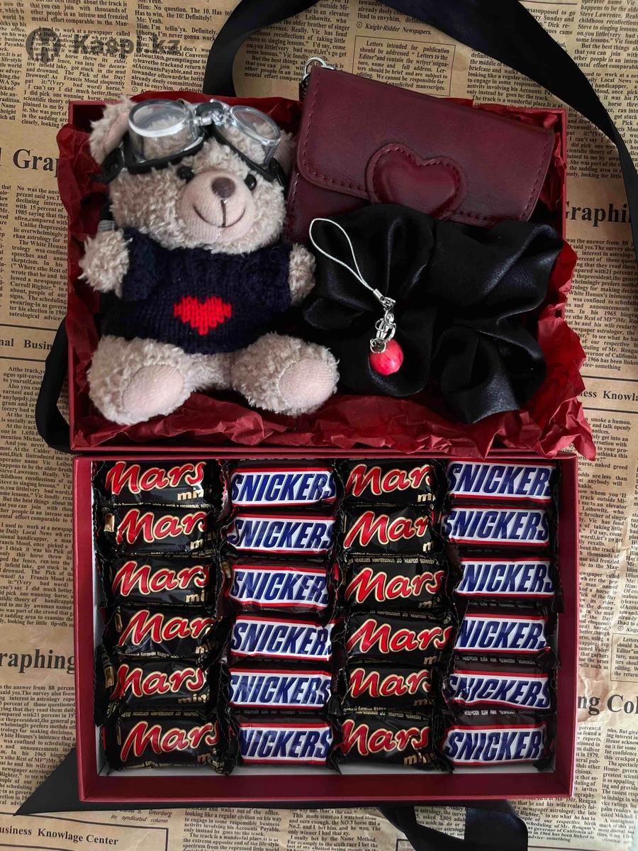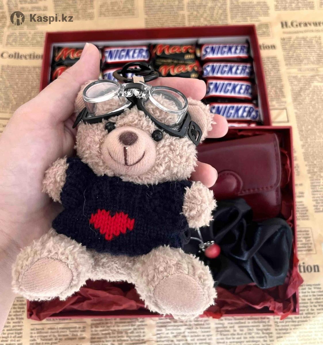 Уникальный подарочный бокс для той самой Подойдет на 14 февраля, день рождения или 8 марта Наполнение: Мишка-брелок Картхолдер с сердечком Брелок яблоко Резинка атласная Сладости: snuckers и mars mini Караганда