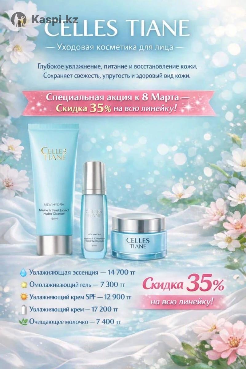 СКИДКИ 35% к 8 марта CELLES TIANE — это уходовая косметика для лица, направленная в первую очередь на глубокое увлажнение и восстановление кожи. Кратко: 👉 Celles Tiane — это линия увлажняющей skincare-косметики с морскими водорослями и дрожжевыми экстрактами, разработанная с использованием японских технологий. Основное действие: -интенсивно увлажняет кожу -питает и восстанавливает клетки -улучшает упругость и эластичность -защищает кожу от сухости и внешних факторов В линейку входят: очищающее молочко, лосьон, эссенции, кремы и эмульсии для ежедневного ухода. 💧 Увлажняющая эссенция — 14 700 тг ✨ Омолаживающий гель — 7 300 тг ☀️ Увлажняющий крем SPF — 12 900 тг 🧴 Увлажняющий крем — 17 200 тг 🌿 Очищающее молочко — 7 400 тг
