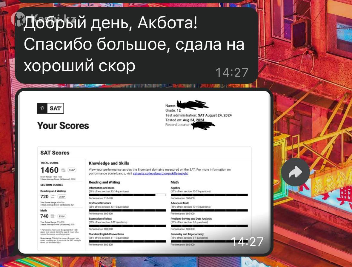 всем привет!! На наших онлайн уроках мы разберемся со всеми модулями Digital SAT(экзамен, который станет обязательным про подаче в американские вузы с 2025 года). Мой результат - 1550( 770 Math, 780 Verbal), который входит в 1% по миру. Мы разберем все модули, я поделюсь всеми советами и полезными материалами. Я предлагаю бесплатную 10-ти минутную сессию для знакомства и определения целей. У меня имеется двухлетний опыт преподавания и более 20 довольных учеников! средний балл учеников секции verbal является 700/800