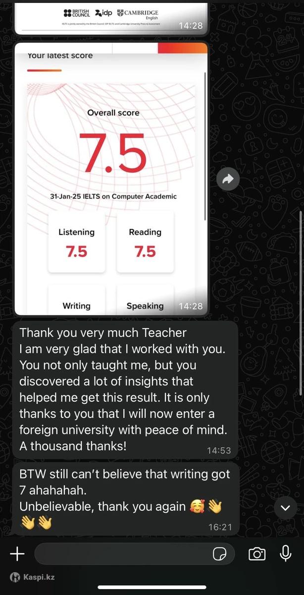 Беру с уровнем Intermediate - strong Pre-intermediate. С Вашей 💯 отдачей, за 2-3 месяца достигнем IELTS 6.0-6.5, а если нужен 7.0-7.5 тоже подтянем. О себе: Окончила бакалавриат и магистратуру (на красный) в НУ. Это первая группа после декрета Поэтому цена символическая, условия выше рынка, ну и отдача от меня будет 💯 так как нужно наработать базу отзывов.