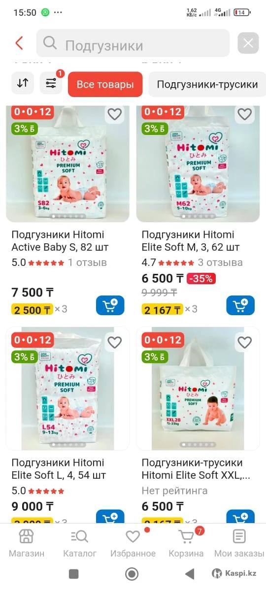 Подгузники Хитоми. Супер качество. Окинбейсиздер. Акция багамен. Аллергия бермейди. С-2 размер 82 штук подгузник М-3 размер 62 штук подгузник Л-4 размер трусики 44 штук Хл-5 размер подгузник 42 штук, трусики 38 штук. 3500 тг багасы. Доставка жок. Адрес мкр Дархан куанышбаева 13 Оптом алып сатсаныздар болады. 10 упаковка жогары.