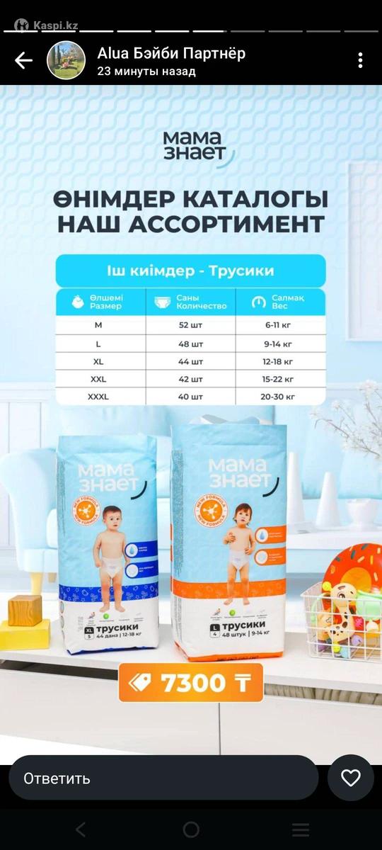 Продам подгузники премиум класса Казахстанского бренда, Baybee, Mammy baby, Мама знает. А также средства личной гигиены, бытовую химию, памперсы для взрослых.