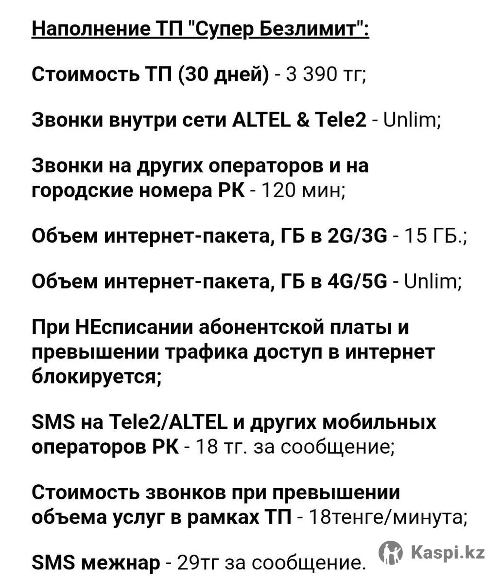 Выгодные акционные тарифы, подключение ТОЛЬКО НА НОВЫЕ НОМЕРА. Актив - в течение 24 часов после активации. Алтел и теле2 - подключение доступно в течение 1 часа после активации номера. Алтел - скидка 50% на 3 месяца. Теле2 - заморозка стоимости тарифа, всегда будет 2590, без изменений, при условии, что абонентская плата будет списана всегда вовремя. Теле2 - Супер Безлимит 3390, полный безлимит в сети 4G/5G. ДЛЯ ДЕЙСТВУЮЩИХ НОМЕРОВ НЕДОСТУПНО!!! Пишите здесь, в чат. Подключение 500.