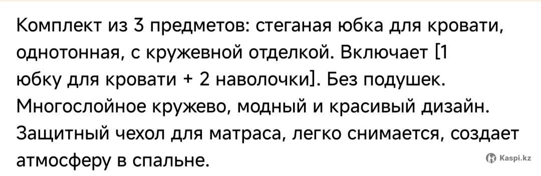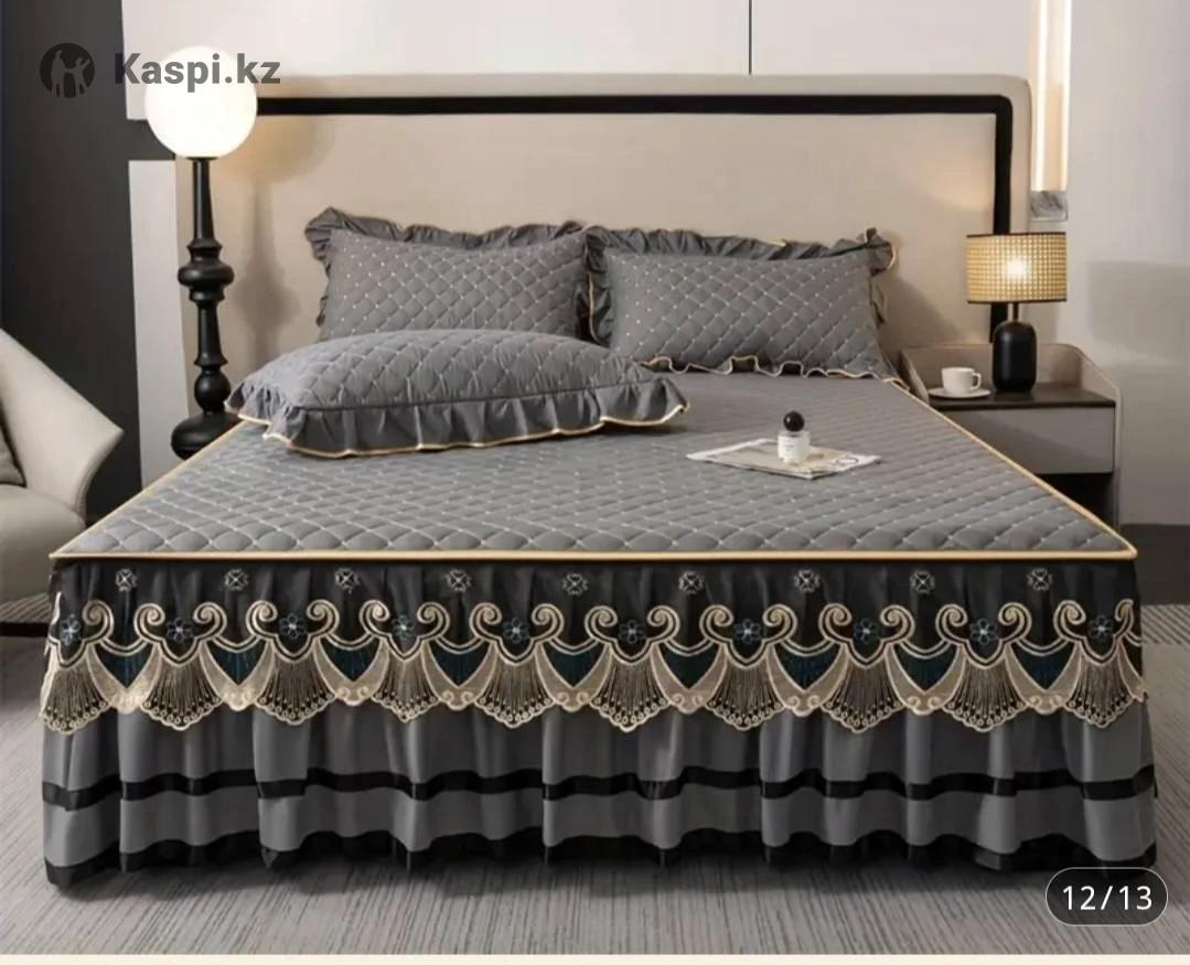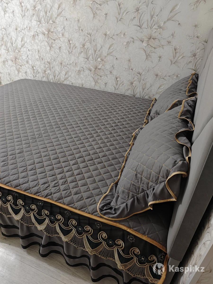 Продается комплект покрывало-юбка и 2наволочки на кровать размером 160 на 200,размер покрывало 150 на 200 подходит идеально, качество очень хорошее,плотное,стелится ,одевается легко,новое,просто цвет не подошёл для интерьера поэтому продаю,цена 13тыс.тенге.