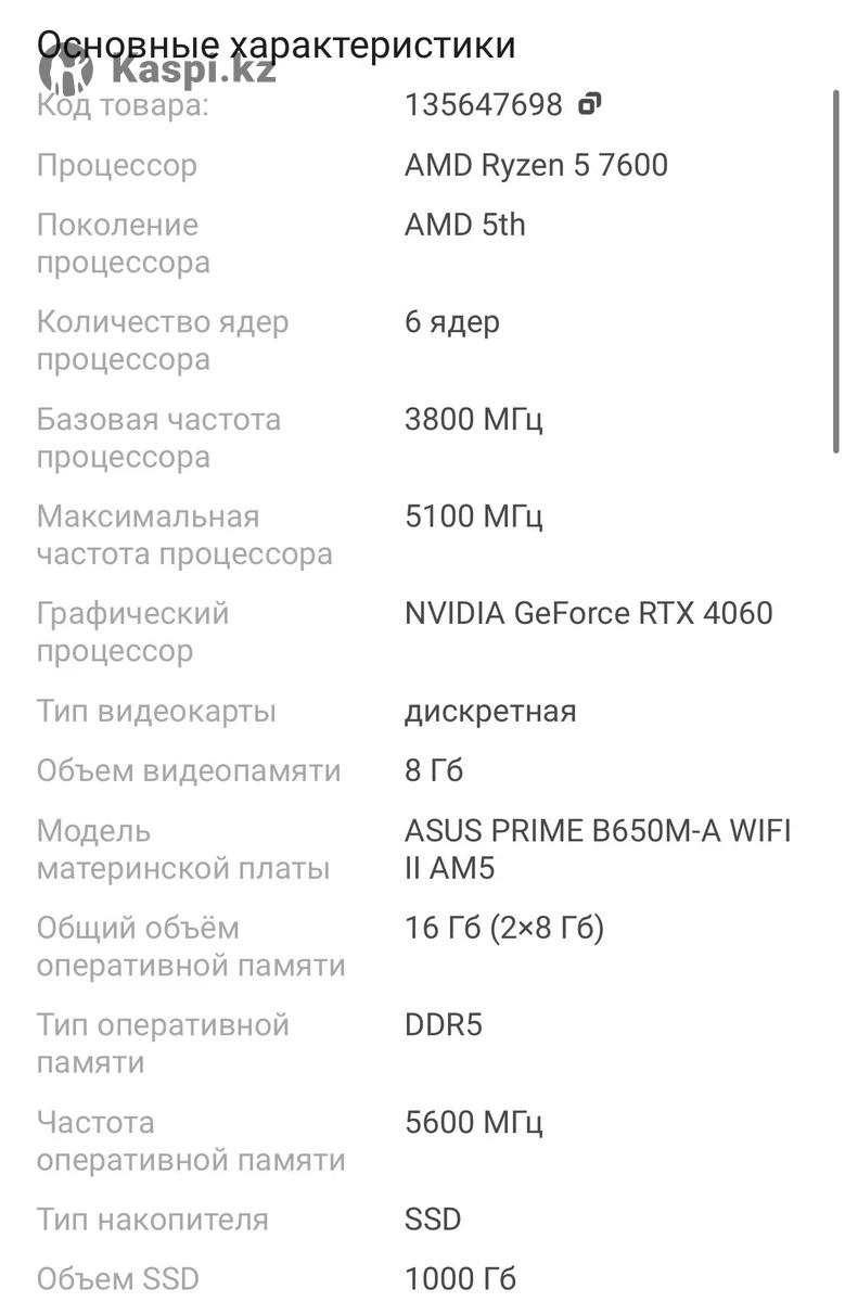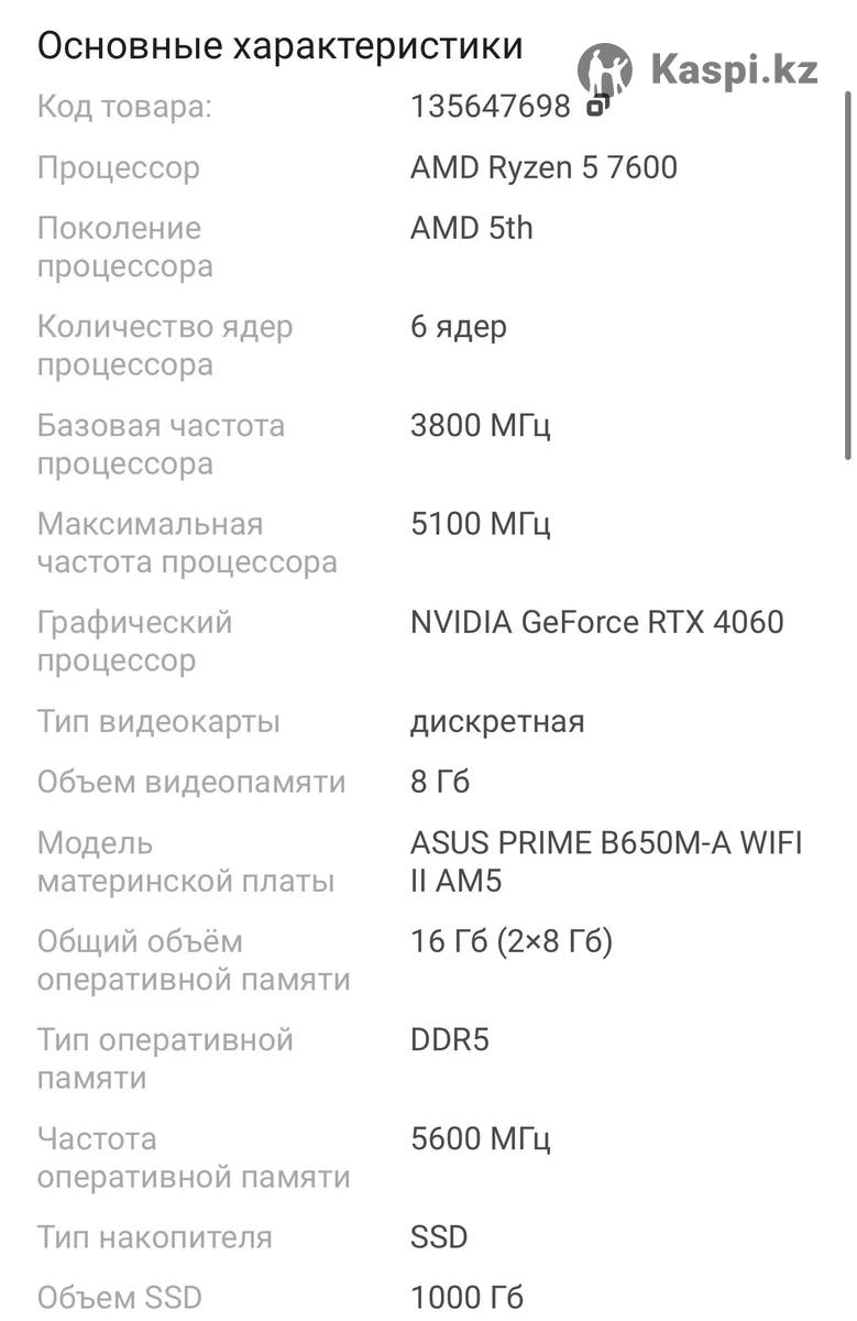 Этот ПК на базе процессора AMD Ryzen 5 7600 обеспечит отличную производительность и многофункциональность благодаря материнской платье ASUS PRIME B650M-А WIFI II с поддержкой DDR5 и множеством слотов PCle. Видеокарта ASUS Dual RTX 4060 EVO OC c 8GB видеопамяти GDDR6 обеспечивает четкое изображение и плавную работу в играх. Система охлаждения ID-COOLING SE-214-XT ARGB WHITE и 16GB оперативной памяти Kingston FURY Beast EXPO RGB DDR5 гарантируют стабильную и отзывчивую работу приложений и игр. Используемые комплектующие: Процессор: AMD Ryzen 5 7600 (C6/T12, (384K L1; 6M L2; 32M L3 Cache) 3.8 up to 5.1 GHZ) AM5 OEM Материнская плата: ASUS PRIME B650M-A WIFI II AM5 4DDR5 PCI-E 3x16 (HDMI+DP+VGA) mATX Видеокарта: ASUS Dual RTX 4060 EVO OC 8GB 128bit/G6 (HDMI+3DP)(DUAL-RTX4060-08G-EVO) Кулер для CPU: ID-COOLING SE-214-XT ARGB WHITE (180W) Оперативная память: DDR5 DIMM 16GB(8GBx2)/5600Mhz PC5-44800 Kingston FURY Beast EXPO RGB Внутренний SSD: M.2 2280 1TB Kingston NV3 PCle 4.0 ×4 NVMe 3D TLC [SNV3S/1000G] Блок питания: Thermaltake Litepower 650W Периферия Гарнитура: HyperX Cloud III Мышь: Logitech Superlight 2 Клавиатура: Коврик: Varmilo Summit Speed XL Производительность в играх CS2 / Valorant — 300+ FPS Fortnite — 200+ FPS GTA V — 120+ FPS Отличный комплект для киберспорта и современных игр. Всё можно проверить при покупке Продаётся полным комплектом Сел и играешь — ничего докупать не нужно