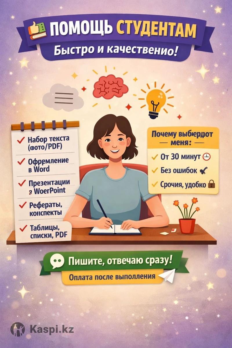 📚 Помощь студентам — быстро и качественно Выполняю любые небольшие задания: • Набор текста (фото/сканы/PDF) • Word — оформление, титульники • PowerPoint — красивые презентации • Рефераты, доклады, конспекты • Редактирование текста • Таблицы, списки, PDF • Поиск информации • Помощь с заданиями колледжа/вуза Поченьу выбирают меня: ✔ Выполняю от 30 минут ✔ Аккуратно, грамотно, без ошибок ✔ Беру срочные заказы ✔ Удобная оплата (после выполнения!) Пишите — отвечаю быстро, возьмусь сразу.