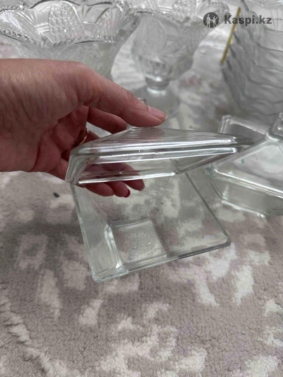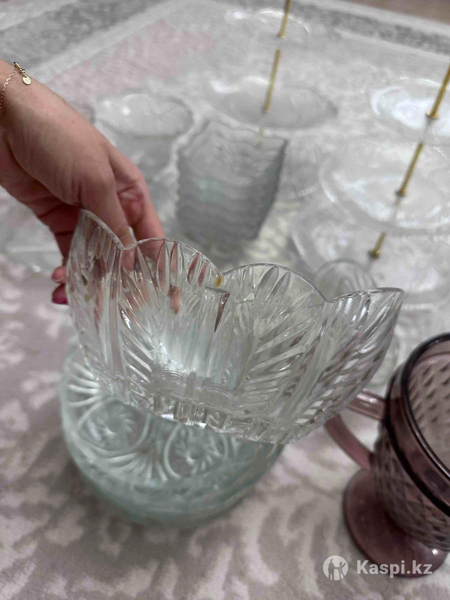 Продам стеклянную посуду, весь набор за 9000тг есть хрустальные и обычные, не битая в хорошем состояний . Этажерка 3 шт, салатница 2 шт, сахарница с крышкой 2 шт, ваза 1 шт , для орех 5 шт, конфетница 2 шт, квадратная 6 шт