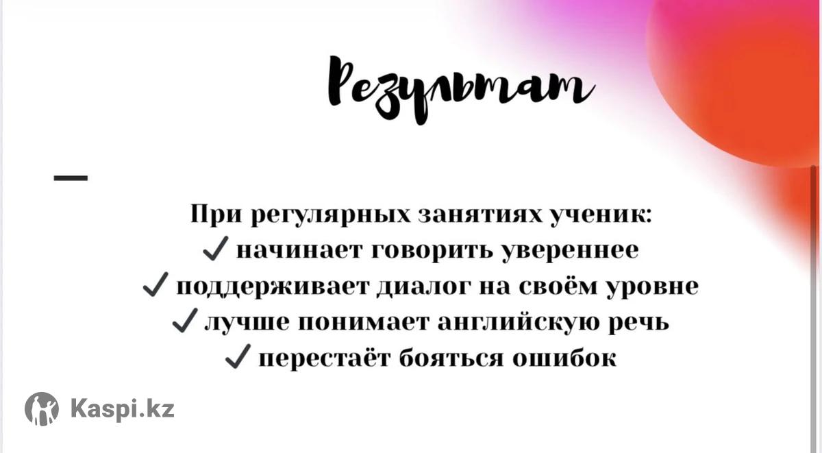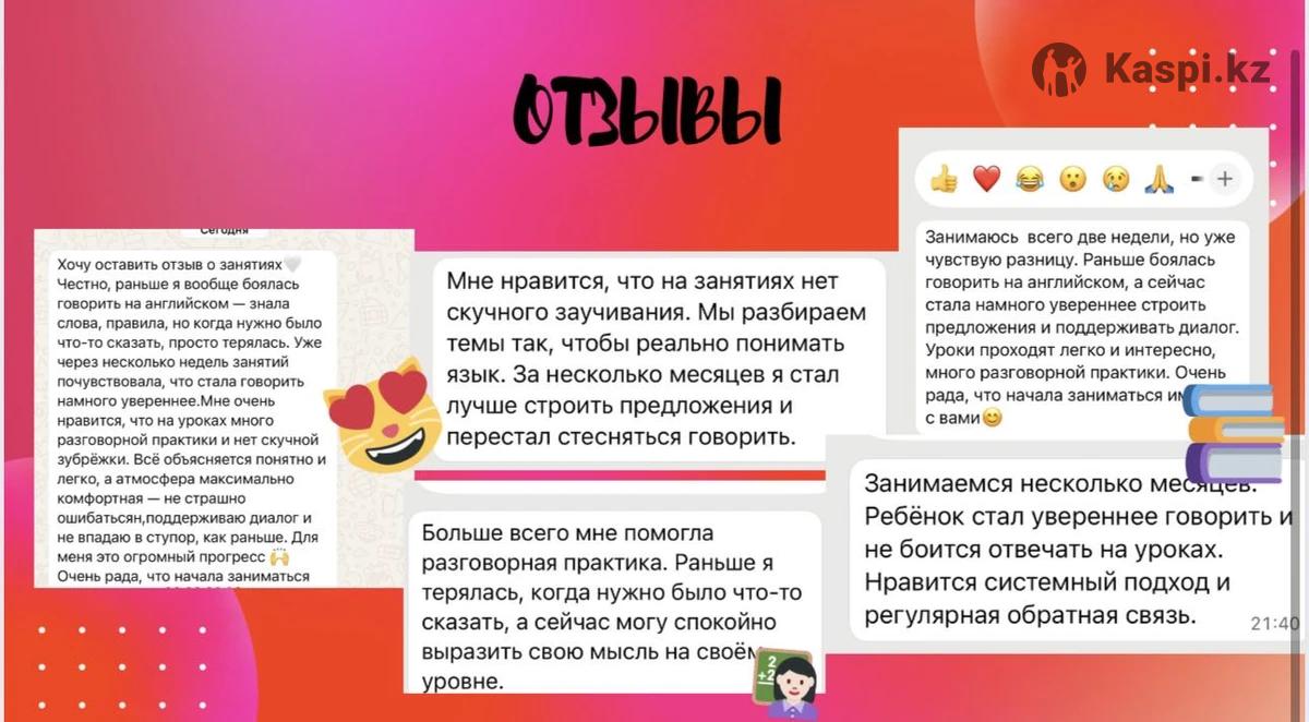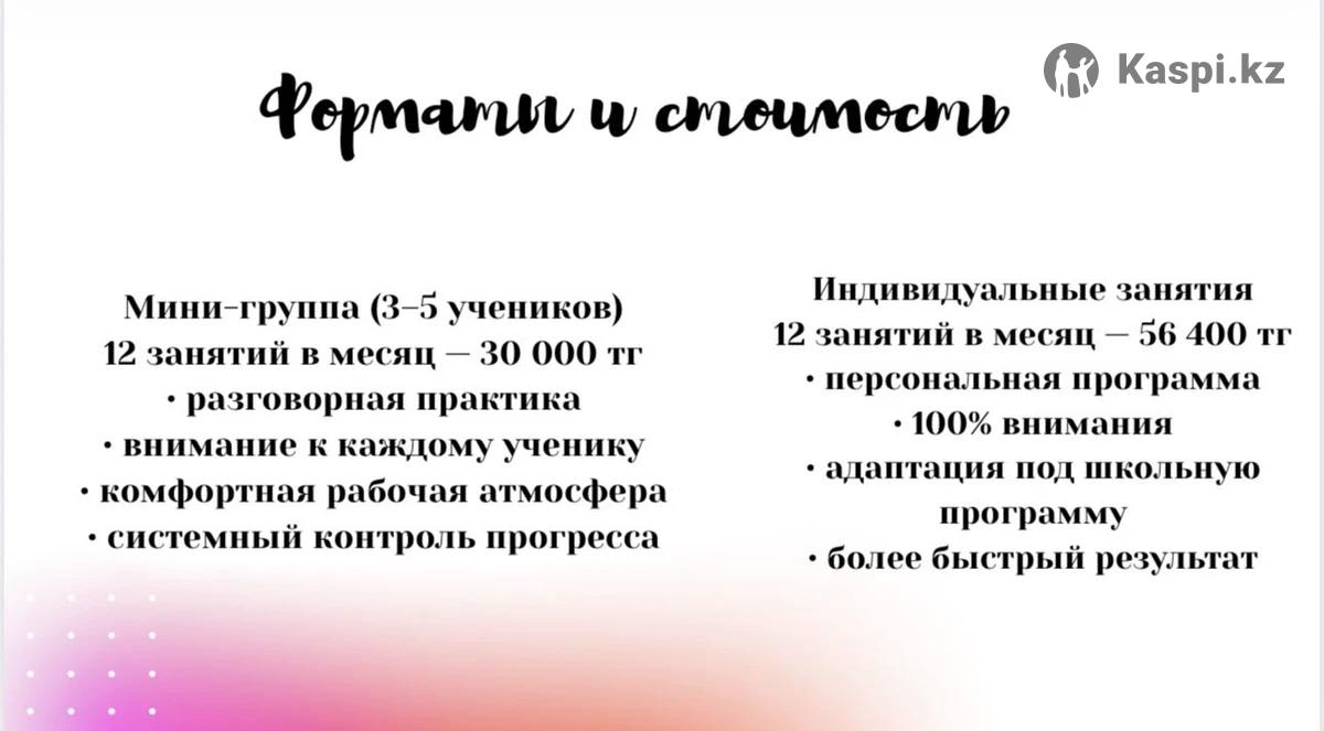 Открыт набор на поток по английскому Если вы или ваш ребёнок: — учите английский несколько лет, но боитесь говорить — понимаете, но не можете свободно выразить мысли — хотите реальный прогресс, а не просто правила Тогда приглашаю на занятия онлайн. Меня зовут Дина. Я изучаю английский более 5 лет и обучаюсь в университете за границей на английском языке. На занятиях делаю акцент на: ✔ разговорную практику с первого урока ✔ понимание грамматики, а не зубрёжку ✔ развитие словарного запаса ✔ уверенность в речи Формат занятий: 3 раза в неделю (12 занятий в месяц) Онлайн через Zoom Стоимость: Мини-группа — 30 000 тг в месяц Индивидуально — 56 400 тг в месяц Пробный урок проводится для определения уровня. Количество мест ограничено.