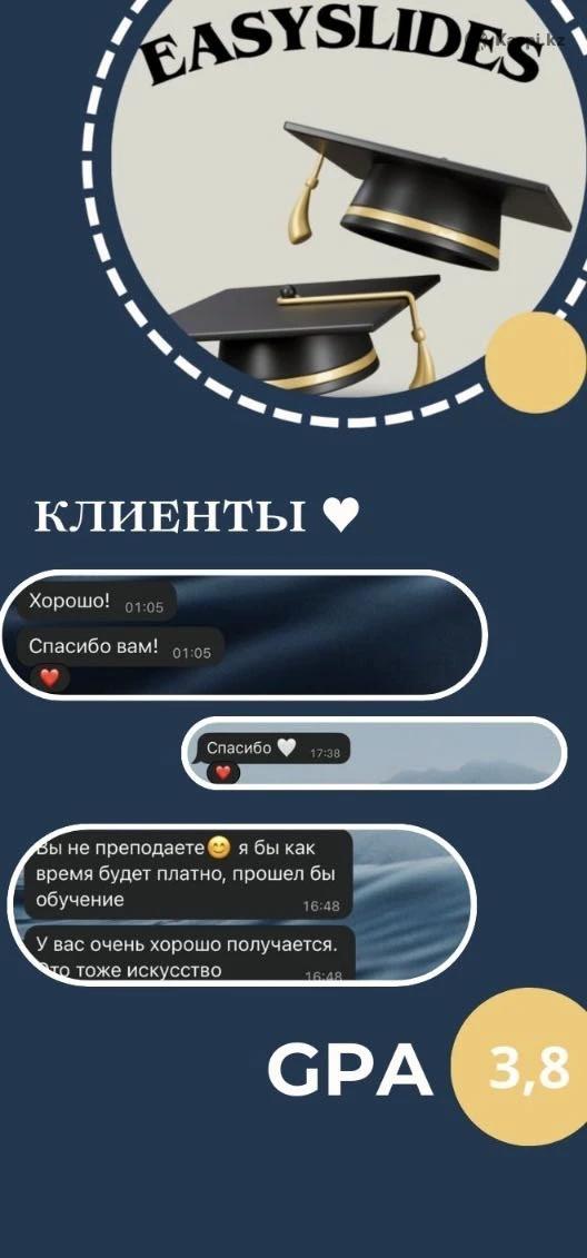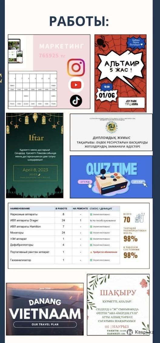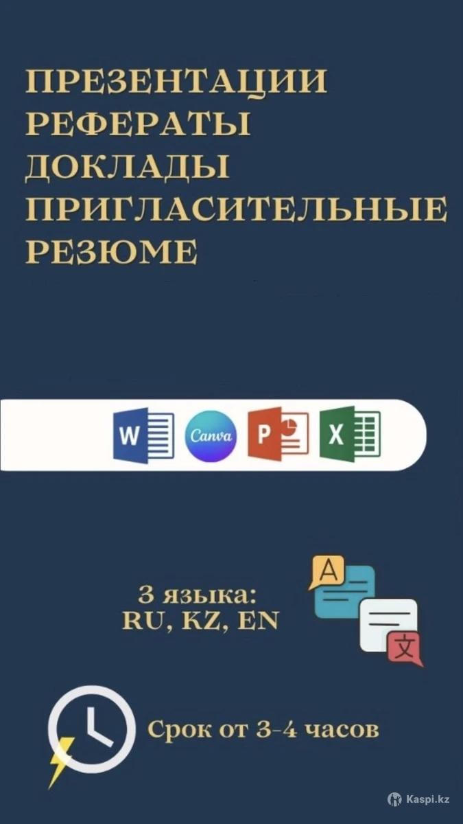 Создаю стильные презентации для бизнеса, учебы и вебинаров и не только Оформляют доклады и рефераты по вашим требованиям Опыт более 5 лет Русский, казахский, английский. Срочные заказы по договоренности.