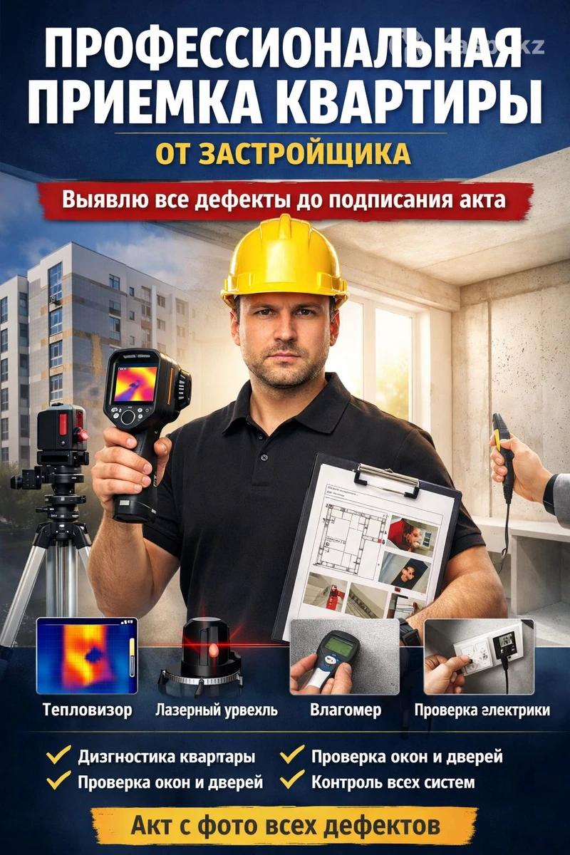 Профессиональная приемка квартиры от застройщика! Отчет подготовлю в день тот же день приемки! Не подписывайте акт приемки, пока квартира не проверена специалистом. Выявлю все дефекты квартиры до подписания документов, чтобы застройщик устранил их за свой счет. Проверка выполняется с использованием профессионального оборудования. Время проверки: 2-3 часов (в зависимости от площади квартиры). Что входит в приемку ✔ Проверка квартиры тепловизором, лазерным уровнем и влагомером ✔ Проверка ровности стен, пола и потолка ✔ Выявление теплопотерь и мостиков холода ✔ Проверка вентиляции, водоснабжения, отопления и канализации ✔ Проверка окон и дверей (качество монтажа, герметичность, работа фурнитуры) ✔ Проверка строительных и отделочных работ Проверка проводится в соответствии со строительными нормами и СНиП РК.