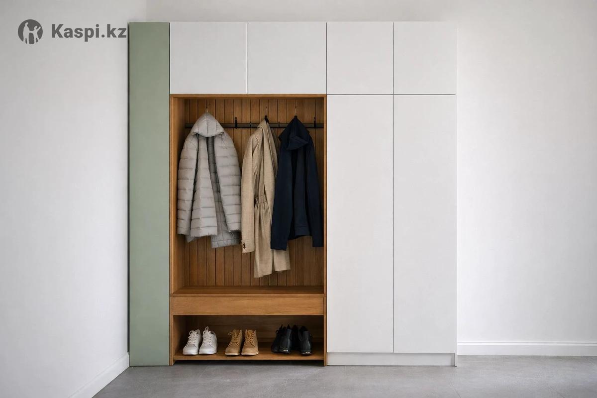Это встроенная прихожая в современном минималистичном стиле. Конструкция: •Слева — вертикальная декоративная панель в мягком оливково-зелёном оттенке. •По центру — открытая ниша с деревянной отделкой (тёплый натуральный тон). •Справа — закрытые шкафы с гладкими белыми фасадами без ручек. Открытая зона: •Настенная рейка с крючками для верхней одежды. •Внизу — удобная лавка для переобувания. •Под лавкой — ниша для хранения обуви. Наполнение: •На крючках размещены куртки и пальто. •Внизу аккуратно стоят пары обуви. Стиль: Современный, лаконичный, без лишних деталей. Контраст тёплого дерева и холодных белых фасадов создаёт аккуратный, дорогой вид. Подойдёт для квартиры или частного дома в светлом интерьере.